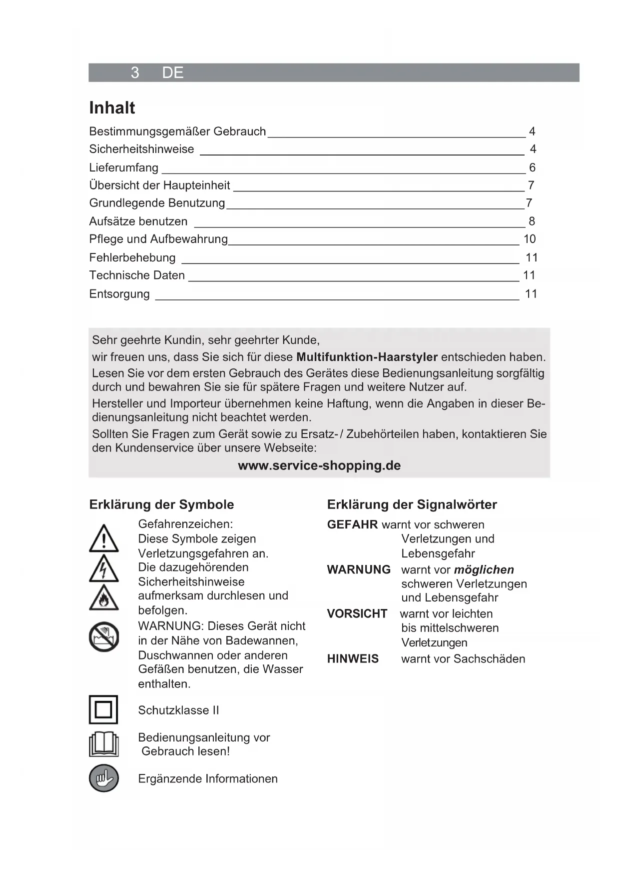 Handleiding vanaf pagina 313 DE Inhalt Bestimmungsgemäßer Gebrauch _______________________________________ 4 Sicherheitshinweise _________________________________________________ 4 Lieferumfang _______________________________________________________ 6 Übersicht der Haupteinheit ____________________________________________ 7 Grundlegende Benutzung _____________________________________________ 7 Aufsätze benutzen __________________________________________________ 8 Pfl ege und Aufbewahrung ____________________________________________ 10 Fehlerbehebung ___________________________________________________ 11 Technische Daten __________________________________________________ 11 Entsorgung _______________________________________________________ 11 Erklärung der Symbole Gefahrenzeichen: Diese Symbole zeigen Verletzungsgefahren an. Die dazugehörenden Sicherheitshinweise aufmerksam durchlesen und befolgen. WARNUNG: Dieses Gerät nicht in der Nähe von Badewannen, Duschwannen oder anderen Gefäßen benutzen, die Wasser enthalten. Schutzklasse II Bedienungsanleitung vor Gebrauch lesen! Ergänzende Informationen Erklärung der Signalwörter GEFAHR warnt vor schweren Verletzungen und Lebensgefahr WARNUNG warnt vor mögliche n schweren Verletzungen und Lebensgefahr VORSICHT warnt vor leichten bis mittelschweren Verletzungen HINWEIS warnt vor Sachschäden Sehr geehrte Kundin, sehr geehrter Kunde, wir freuen uns, dass Sie sich für diese Multifunktion-Haarstyler entschieden haben. Lesen Sie vor dem ersten Gebrauch des Gerätes diese Bedienungsanleitung sorgfältig durch und bewahren Sie sie für spätere Fragen und weitere Nutzer auf. Hersteller und Importeur übernehmen keine Haftung, wenn die Angaben in dieser Be- dienungsanleitung nicht beachtet werden. Sollten Sie Fragen zum Gerät sowie zu Ersatz- / Zubehörteilen haben, kontaktieren Sie den Kundenservice über unsere Webseite: www.service-shopping.deDE 4 Bestimmungsgemäßer Gebrauch