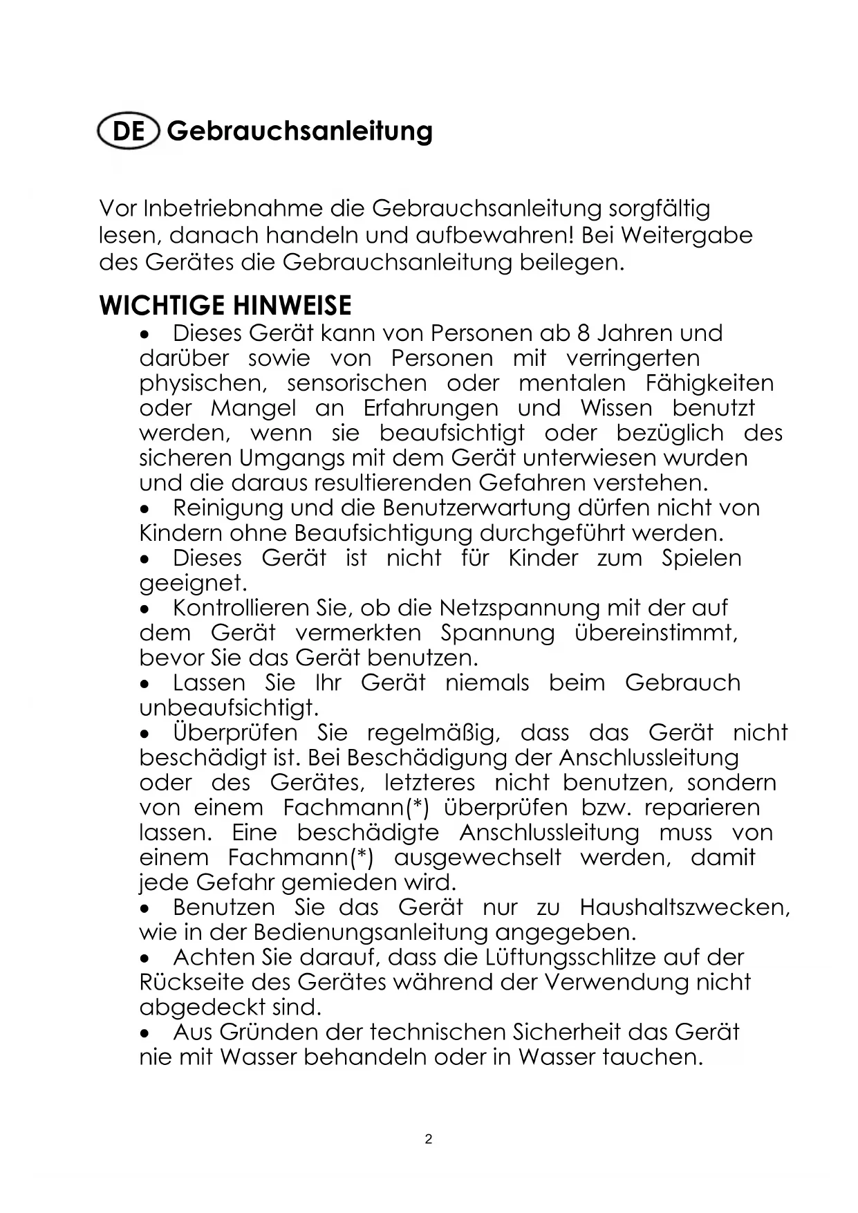 UVA-Lampen dürfen nur durch baugleiche Typen ersetzt werden. Bestrahlungsröhren enthalten wie alle Leuchtstoffröhren spezifische Beimischungen. Sie gehören nicht in den Hausmüll. Defekte Bestrahlungsröhren werden wie Sondermüll entsorgt. Starterwechsel Die Starter befinden sich in der Rückwand des Gerätes. Den Starter durch kurze Linksdrehung entrasten und nach oben herausnehmen. Neuen Starter einsetzen. Den neuen Starter durch kurze Rechtsdrehung einrasten. Reparaturhinweise Wenn Lampen nach dem Einschalten nicht aufleuchten, die Lampen leicht hin- und herdrehen. Sollten funktionsfähige Geräte mit nicht aufleuchtenden aber funktionsfähigen Lampen eingesandt werden handelt es sich nicht um einen Garantiefall. Wir haften auch bei einem neuen Gerät nicht für Glasbruch, wie auch nicht für Transportschäden bei Reparaturgeräten, die mit unzureichender Verpackung eingesandt wurden. Wir empfehlen, die vollständige Originalverpackung aufzubewahren. Reparaturen, einschließlich Austausch der Anschlussleitung, dürfen nur durch den Hersteller oder seinen Kundendienst oder eine ähnlich qualifizierte Person durchgeführt werden, um Gefährdungen zu vermeiden.User Instruction Before the utilization, read the instruction careful, act accordingly and store it! When you pass the appliance then enclose the User Instruction. IMPORTANT INFORMATIONS This appliance can be used by persons of 8 years of age or more and people with reduced physical, sensory or mental capacities or with a lack of experience or knowledge if they have been given supervision or instructions concerning the safe use of the appliance and the risks involved. Cleaning and user maintenance shall not be made by persons under the age of 18 . Children shall not play with the appliance. Check that your mains voltage corresponds to that stated on the appliance. Never leave the appliance unsupervised when in use. From time to time check the appliance for damages. Never use the appliance if cord or appliance shows any signs of damage. In that case, repairs should be made by a competent qualified electrician(*). Should the cord be damaged, it must be replaced by a competent qualified electrician(*) in order to avoid all danger. Only use the appliance for domestic purposes and in the way indicated in these instructions. Do not cover the vent slots at the back of the appliance while in use. Never immerse the appliance in water or any other liquid for any reason whatsoever. Never place it into the dishwasher. Do not use the appliance near water (e.g. in the Bathroom, near the shower or a sink. Never use the appliance near hot surfaces. Before cleaning, always unplug the appliance from the power supply. Never use the appliance outside and always place it in a dry environment.
