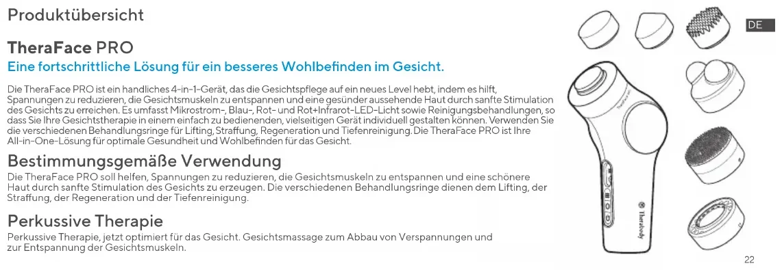 Produktübersicht TheraFace PRO Eine fortschrittliche Lösung für ein besseres Wohlbenden im Gesicht. Die TheraFace PRO ist ein handliches 4-in-1-Gerät, das die Gesichtspflege auf ein neues Level hebt, indem es hilft, Spannungen zu reduzieren, die Gesichtsmuskeln zu entspannen und eine gesünder aussehende Haut durch sanfte Stimulation des Gesichts zu erreichen. Es umfasst Mikrostrom-, Blau-, Rot- und Rot+Infrarot-LED-Licht sowie Reinigungsbehandlungen, so dass Sie Ihre Gesichtstherapie in einem einfach zu bedienenden, vielseitigen Gerät individuell gestalten können. Verwenden Sie die verschiedenen Behandlungsringe für Lifting, Straung, Regeneration und Tiefenreinigung. Die TheraFace PRO ist Ihre All-in-One-Lösung für optimale Gesundheit und Wohlbenden für das Gesicht. Bestimmungsgemäße Verwendung Perkussive Therapie Die TheraFace PRO soll helfen, Spannungen zu reduzieren, die Gesichtsmuskeln zu entspannen und eine schönere Haut durch sanfte Stimulation des Gesichts zu erzeugen. Die verschiedenen Behandlungsringe dienen dem Lifting, der Straung, der Regeneration und der Tiefenreinigung. Perkussive Therapie, jetzt optimiert für das Gesicht. Gesichtsmassage zum Abbau von Verspannungen und zur Entspannung der Gesichtsmuskeln.23