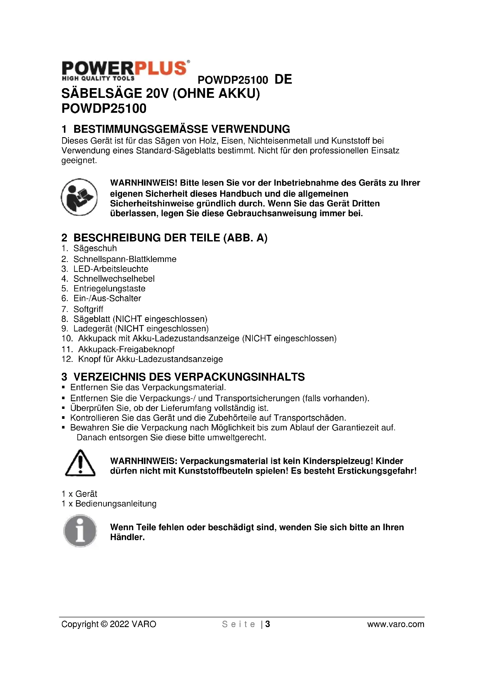 - Das Werkzeug nicht starten, wenn das Sägeblatt ein anderes Objekt berührt. Die Sägebewegung wird einen Rückschlag des Werkzeugs verursachen, was Verletzungen zur Folge haben kann.POWDP25100 DE Copyright © 2022 VARO S e i t e | 7 www.varo.com
