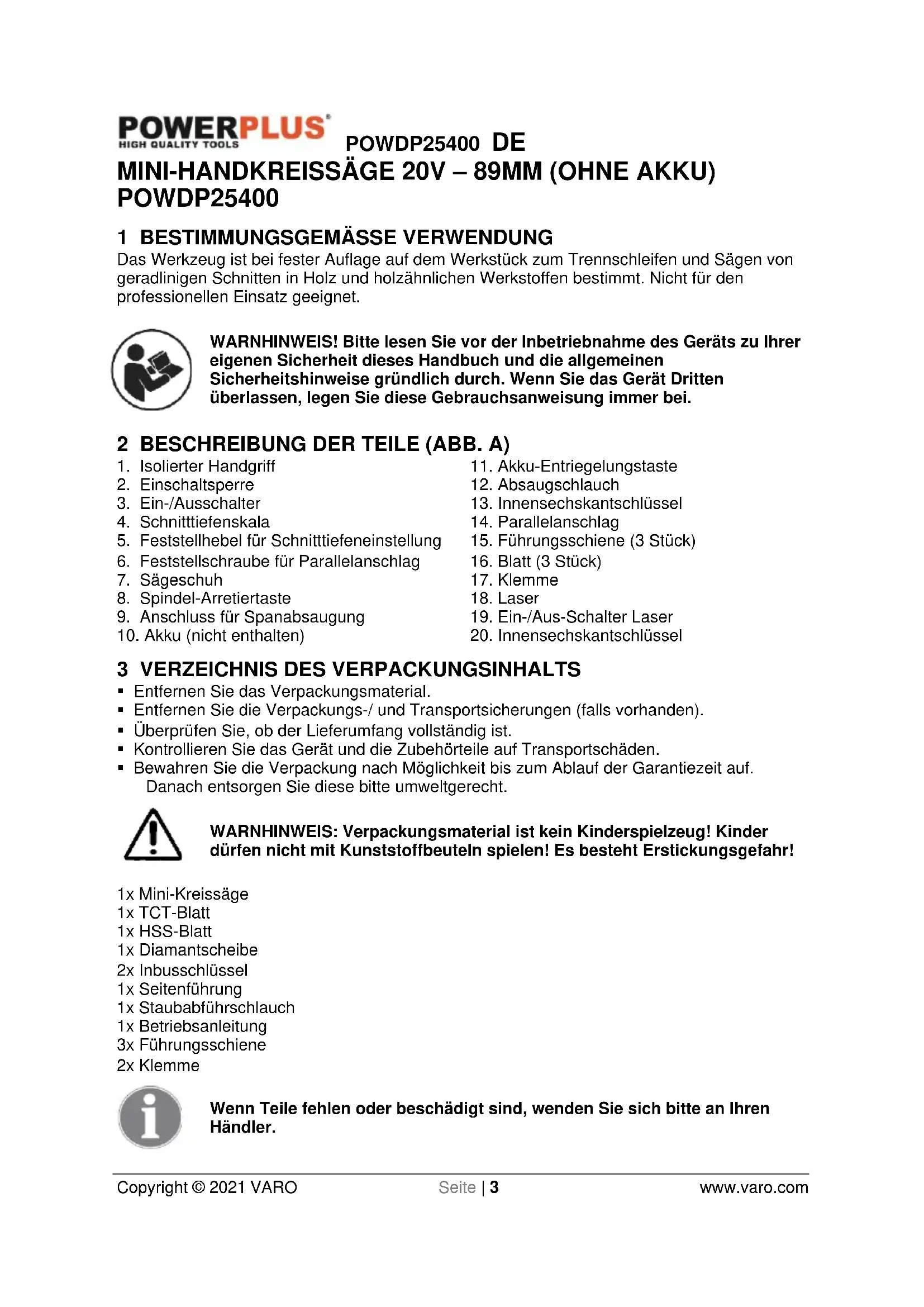 - Bewahren Sie die Verpackung nach Möglichkeit bis zum Ablauf der Garantiezeit auf. Danach entsorgen Sie diese bitte umweltgerecht. WARNHINWEIS: Verpackungsmaterial ist kein Kinderspielzeug! Kinder dürfen nicht mit Kunststoffbeuteln spielen! Es besteht Erstickungsgefahr! 1x Mini-Kreissäge 1x TCT-Blatt 1x HSS-Blatt 1x Diamantscheibe 2x Inbusschlüssel 1x Seitenführung 1x Staubabführschlauch 1x Betriebsanleitung 3x Führungsschiene 2x Klemme Wenn Teile fehlen oder beschädigt sind, wenden Sie sich bitte an Ihren Händler.POWDP25400 DE Copyright © 2021 VARO Seite | 4 www.varo.com