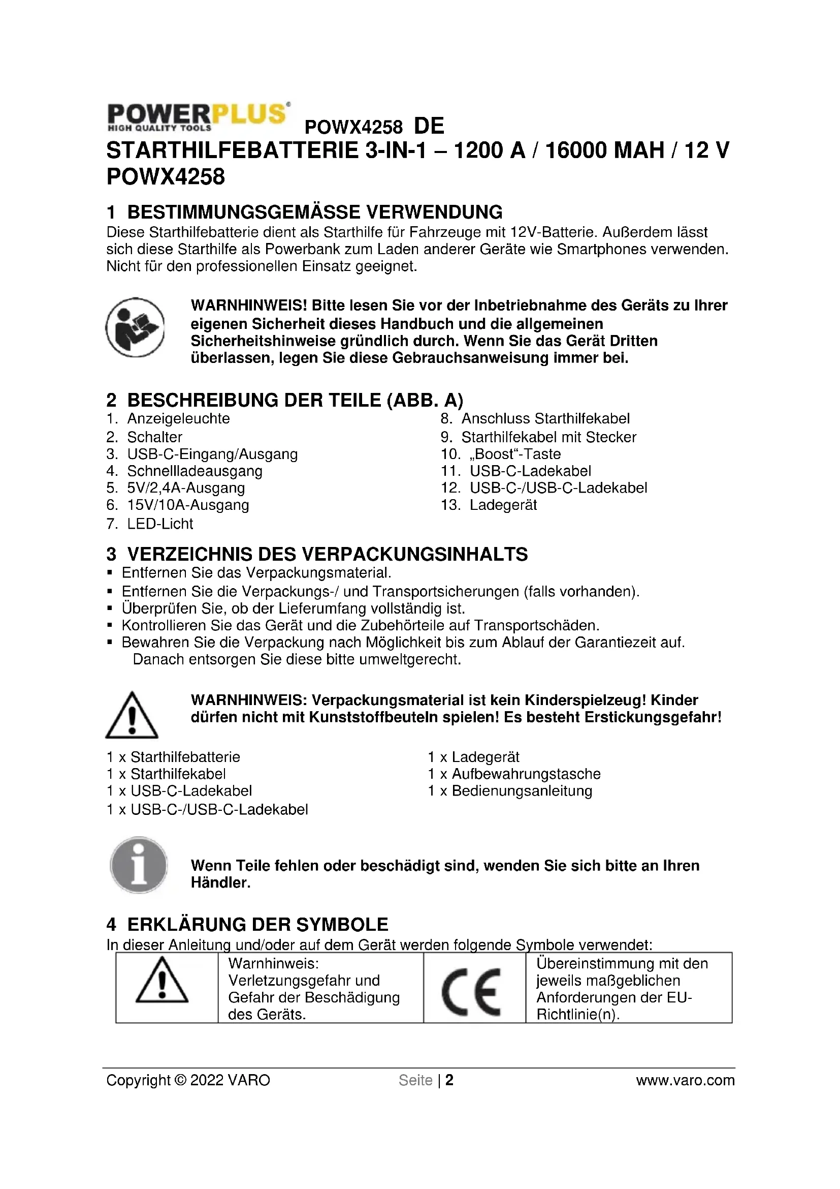 Umgebungstemperatur bei Starthilfe -20 °C - +60 °C 9 UMWELT Werfen Sie Ihr Gerät nach der Nutzungsdauer nicht einfach in den Mülleimer, sondern entsorgen Sie es auf umweltfreundliche Weise. Sie dürfen es nicht in den normalen Hausmüll geben, sondern Sie müssen es in zugelassenen Anlagen umweltgerecht durch Recycling entsorgen lassen. Bitte erkundigen Sie sich bei der örtlichen Behörde oder beim Vertragshändler über das Recycling.POWX4258 DE Copyright © 2022 VARO Seite | 8 www.varo.com