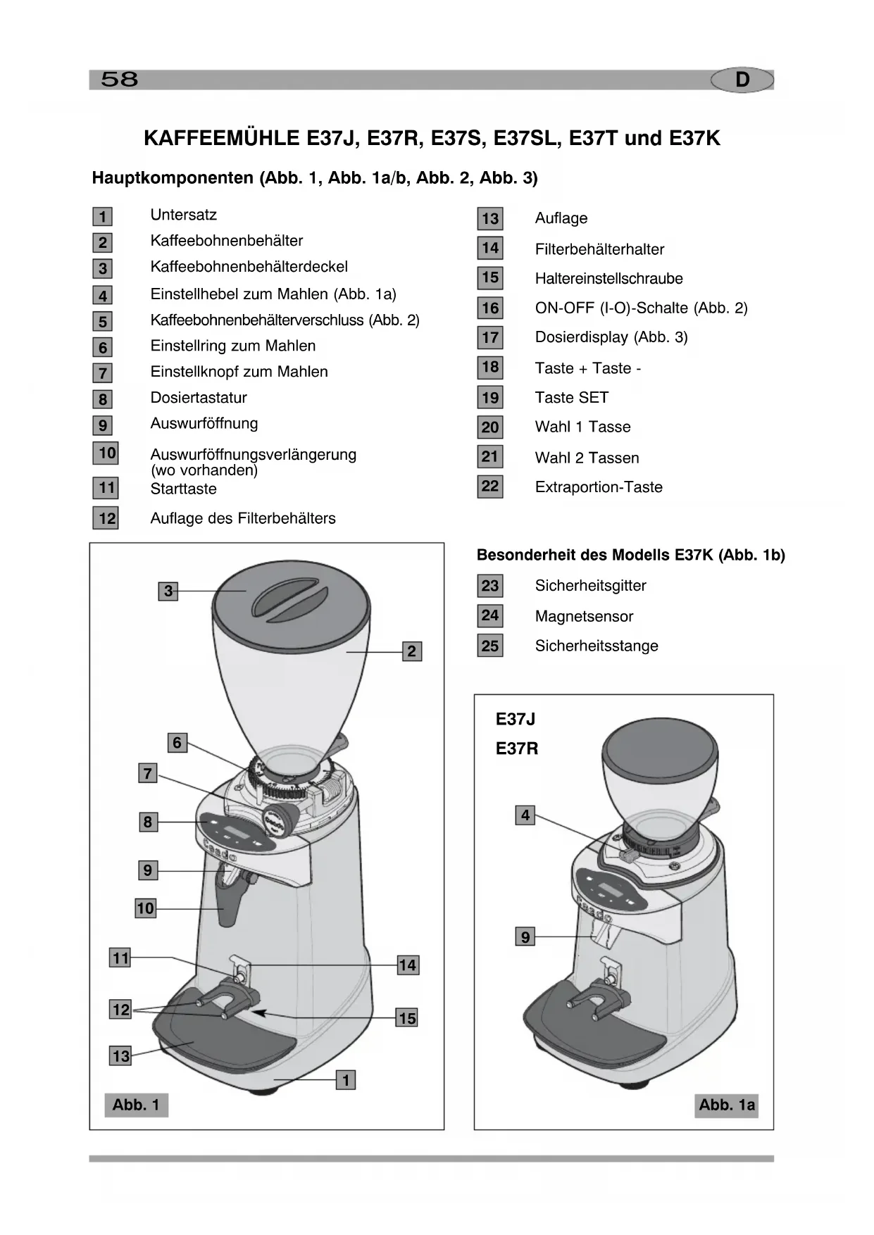 KAFFEEMÜHLE E37J, E37R, E37S, E37SL, E37T und E37K Die Kaffeemühlen Modell E37J, E37R, E37S, E37SL, E37T und E37K sind Profigeräte zum Mahlen und nachfolgenden Verteilen des Kaffees durch eine Auswurföffnung. Wie bei allen anderen Hausgeräte muss man bei der Verwendung der Geräte besonders vorsichtig sein, um Körperverletzungen zu vermeiden und das Gerät nicht zu beschädigen. Daher muss man die vorliegenden Anweisungen vor der Inbetriebnahme gründlich lesen und die Sicherheitsvorschriften befolgen. Das Gerät auf keinen Fall verwenden, wenn man die Bedienungsanleitung nicht eingehend kennt! MOLINILLO DE CAFÉ E37J, E37R, E37S, E37SL, E37T y E37K Los molinillos de café modelo E37J, E37R, E37S, E37SL, E37T y E37K son aparatos profesionales para moler el café y para distribuir el mismo por medio de una boca de descarga. Como todos los electrodomésticos se tiene que utilizar con mucha prudencia para evitar lesiones a personas y daños en el aparato. Por lo tanto, leer con cuidado las siguientes instrucciones para el uso antes de la puesta en funcionamiento y respetar las prescripciones correspondientes a la seguridad. ¡No utilizar el aparato si no se conocen correctamente las instrucciones para el uso! Seite 58