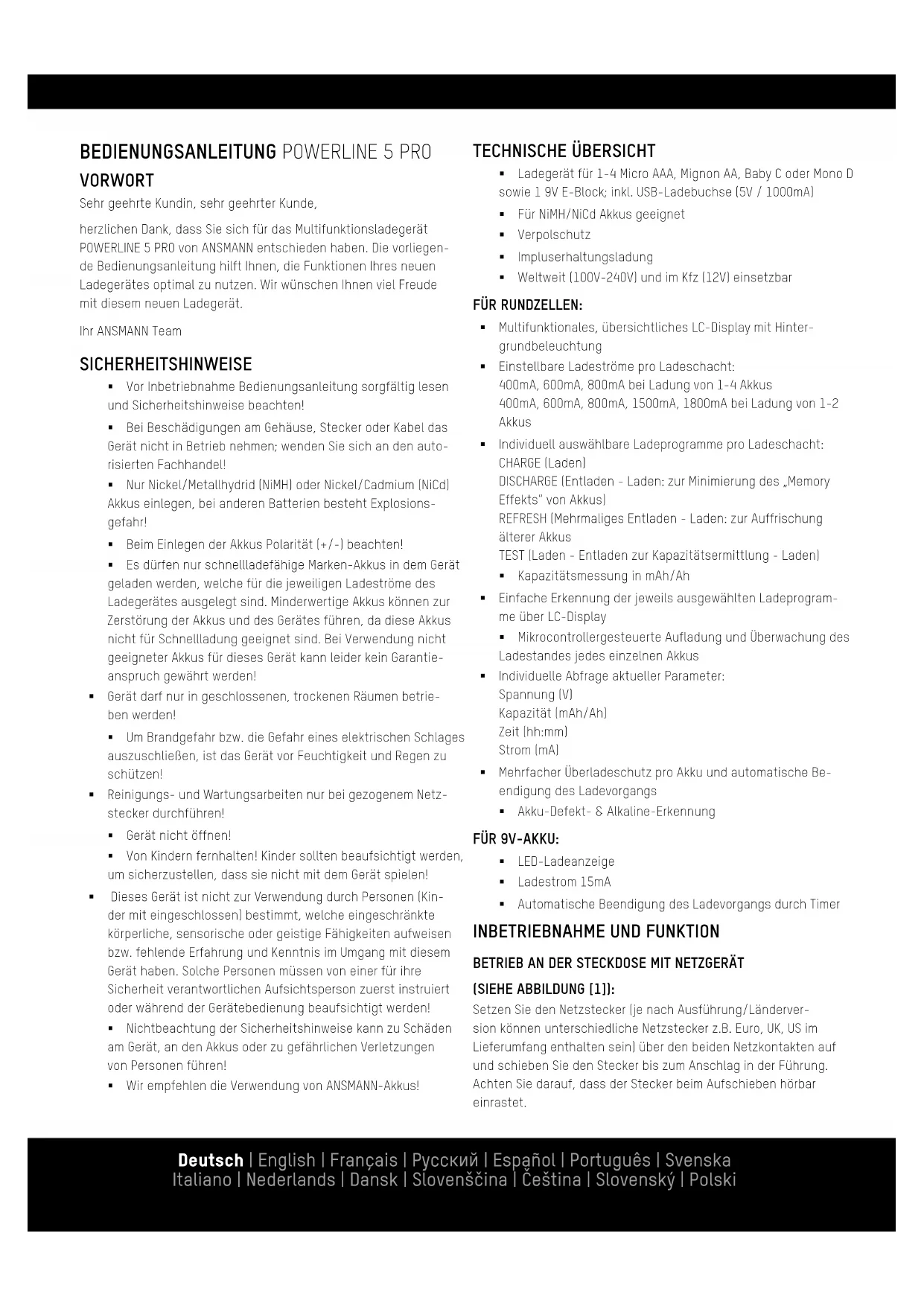 VORWORT Sehr geehrte Kundin, sehr geehrter Kunde, herzlichen Dank, dass Sie sich für das Multifunktionsladegerät POWERLINE 5 PRO von ANSMANN entschieden haben. Die vorliegen- de Bedienungsanleitung hilft Ihnen, die Funktionen Ihres neuen Ladegerätes optimal zu nutzen. Wir wünschen Ihnen viel Freude mit diesem neuen Ladegerät. Ihr ANSMANN Team SICHERHEITSHINWEISE Vor Inbetriebnahme Bedienungsanleitung sorgfältig lesen und Sicherheitshinweise beachten! Bei Beschädigungen am Gehäuse, Stecker oder Kabel das Gerät nicht in Betrieb nehmen; wenden Sie sich an den auto- risierten Fachhandel! Nur Nickel/Metallhydrid (NiMH) oder Nickel/Cadmium (NiCd) Akkus einlegen, bei anderen Batterien besteht Explosions- gefahr! Beim Einlegen der Akkus Polarität (+/-) beachten! Es dürfen nur schnellladefähige Marken-Akkus in dem Gerät geladen werden, welche für die jeweiligen Ladeströme des Ladegerätes ausgelegt sind. Minderwertige Akkus können zur Zerstörung der Akkus und des Gerätes führen, da diese Akkus nicht für Schnellladung geeignet sind. Bei Verwendung nicht geeigneter Akkus für dieses Gerät kann leider kein Garantie- anspruch gewährt werden! Gerät darf nur in geschlossenen, trockenen Räumen betrie- ben werden! Um Brandgefahr bzw. die Gefahr eines elektrischen Schlages auszuschließen, ist das Gerät vor Feuchtigkeit und Regen zu schützen! Reinigungs- und Wartungsarbeiten nur bei gezogenem Netz- stecker durchführen! Gerät nicht öffnen! Von Kindern fernhalten! Kinder sollten beaufsichtigt werden, um sicherzustellen, dass sie nicht mit dem Gerät spielen! Dieses Gerät ist nicht zur Verwendung durch Personen (Kin- der mit eingeschlossen) bestimmt, welche eingeschränkte körperliche, sensorische oder geistige Fähigkeiten aufweisen bzw. fehlende Erfahrung und Kenntnis im Umgang mit diesem Gerät haben. Solche Personen müssen von einer für ihre Sicherheit verantwortlichen Aufsichtsperson zuerst instruiert oder während der Gerätebedienung beaufsichtigt werden! Nichtbeachtung der Sicherheitshinweise kann zu Schäden am Gerät, an den Akkus oder zu gefährlichen Verletzungen von Personen führen! Wir empfehlen die Verwendung von ANSMANN-Akkus! TECHNISCHE ÜBERSICHT Ladegerät für 1-4 Micro AAA, Mignon AA, Baby C oder Mono D sowie 1 9V E-Block; inkl. USB-Ladebuchse (5V / 1000mA) Für NiMH/NiCd Akkus geeignet Verpolschutz Impluserhaltungsladung Weltweit (100V-240V) und im Kfz (12V) einsetzbar FÜR RUNDZELLEN: Multifunktionales, übersichtliches LC-Display mit Hinter- grundbeleuchtung Einstellbare Ladeströme pro Ladeschacht: 400mA, 600mA, 800mA bei Ladung von 1-4 Akkus 400mA, 600mA, 800mA, 1500mA, 1800mA bei Ladung von 1-2 Akkus Individuell auswählbare Ladeprogramme pro Ladeschacht: CHARGE (Laden) DISCHARGE (Entladen - Laden: zur Minimierung des „Memory Effekts“ von Akkus) REFRESH (Mehrmaliges Entladen - Laden: zur Auffrischung älterer Akkus TEST (Laden - Entladen zur Kapazitätsermittlung - Laden) Kapazitätsmessung in mAh/Ah Einfache Erkennung der jeweils ausgewählten Ladeprogram- me über LC-Display Mikrocontrollergesteuerte Aufladung und Überwachung des Ladestandes jedes einzelnen Akkus Individuelle Abfrage aktueller Parameter: Spannung (V) Kapazität (mAh/Ah) Zeit (hh:mm) Strom (mA) Mehrfacher Überladeschutz pro Akku und automatische Be- endigung des Ladevorgangs Akku-Defekt- & Alkaline-Erkennung FÜR 9V-AKKU: LED-Ladeanzeige Ladestrom 15mA Automatische Beendigung des Ladevorgangs durch Timer