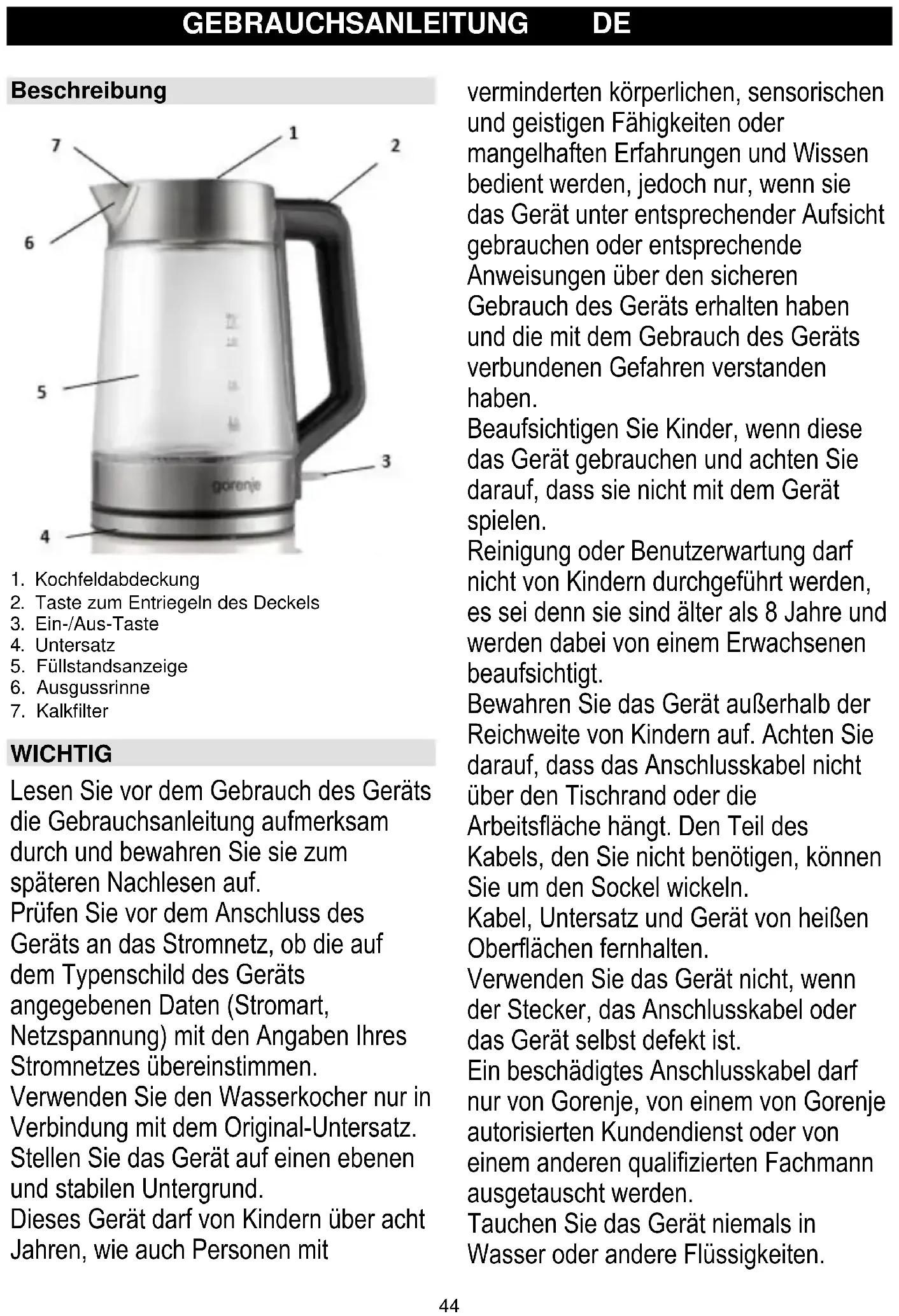 WICHTIG Lesen Sie vor dem Gebrauch des Geräts die Gebrauchsanleitung aufmerksam durch und bewahren Sie sie zum späteren Nachlesen auf. Prüfen Sie vor dem Anschluss des Geräts an das Stromnetz, ob die auf dem Typenschild des Geräts angegebenen Daten (Stromart, Netzspannung) mit den Angaben Ihres Stromnetzes übereinstimmen. Verwenden Sie den Wasserkocher nur in Verbindung mit dem Original-Untersatz. Stellen Sie das Gerät auf einen ebenen und stabilen Untergrund. Dieses Gerät darf von Kindern über acht Jahren, wie auch Personen mit verminderten körperlichen, sensorischen und geistigen Fähigkeiten oder mangelhaften Erfahrungen und Wissen bedient werden, jedoch nur, wenn sie das Gerät unter entsprechender Aufsicht gebrauchen oder entsprechende Anweisungen über den sicheren Gebrauch des Geräts erhalten haben und die mit dem Gebrauch des Geräts verbundenen Gefahren verstanden haben. Beaufsichtigen Sie Kinder, wenn diese das Gerät gebrauchen und achten Sie darauf, dass sie nicht mit dem Gerät spielen. Reinigung oder Benutzerwartung darf nicht von Kindern durchgeführt werden, es sei denn sie sind älter als 8 Jahre und werden dabei von einem Erwachsenen beaufsichtigt. Bewahren Sie das Gerät außerhalb der Reichweite von Kindern auf. Achten Sie darauf, dass das Anschlusskabel nicht über den Tischrand oder die Arbeitsfläche hängt. Den Teil des Kabels, den Sie nicht benötigen, können Sie um den Sockel wickeln. Kabel, Untersatz und Gerät von heißen Oberflächen fernhalten. Verwenden Sie das Gerät nicht, wenn der Stecker, das Anschlusskabel oder das Gerät selbst defekt ist. Ein beschädigtes Anschlusskabel darf nur von Gorenje, von einem von Gorenje autorisierten Kundendienst oder von einem anderen qualifizierten Fachmann ausgetauscht werden. Tauchen Sie das Gerät niemals in Wasser oder andere Flüssigkeiten.45 Verwenden Sie den Wasserkocher nur zum Aufkochen von Wasser. Den Wasserkocher darf nicht zum Aufwärmen von Suppen oder anderen Flüssigkeiten und eingelegten Lebensmitteln verwendet werden. Heißes Wasser kann Verbrühungen verursachen. Seien Sie vorsichtig, wenn sich heißes Wasser im Gerät befindet. Achten Sie darauf, dass das Gerät nur bis zur Markierung „Max.“ mit Wasser gefüllt wird. Falls in den Wasserkocher zu viel Wasser eingefüllt wird, kann das kochende Wasser aus dem Wasserkocher spritzen und Verbrühungen verursachen. Den Deckel nicht öffnen, wenn das Wasser siedet! Seien Sie beim Öffnen des Deckels unmittelbar nach dem Aufkochen des Wassers vorsichtig; der Dampf im Behälter ist sehr heiß. Das Gehäuse des Geräts nicht berühren, da es während des Betriebs sehr heiß wird. Heben Sie den Wasserkocher vom Untersatz, indem Sie ihn am Handgriff halten. Das Wasser muss den Boden des Behälters bedecken, sonst kann es verdunsten und den Wasserkocher austrocknen. Am Deckel des Geräts und am Untersatz kann sich Kondenswasser ansammeln. Das ist völlig normal und stellt keinen Fehler dar. Wenn Sie das Gerät benutzen, können je nach Härtegrad des Wassers auf dem Heizelement des Geräts Flecken erscheinen. Dies wird durch Kalkablagerungen verursacht, die sich mit der Zeit auf dem Heizelement und im Inneren des Geräts ablagern. Je härter das Wasser ist, umso schneller lagert sich Kalkstein am Heizelement ab. Kalkstein kann verschiedene Farben haben. Obwohl diese Kalkablagerungen nicht schädlich sind, kann eine zu große Menge davon den Betrieb des Geräts beeinträchtigen. Deswegen sollten Sie die Kalkablagerungen regelmäßig entfernen (siehe Kapitel „Entkalken“). Dieses Gerät ist gemäß der EU-Richtlinie 2012/19/EU über elektrische und elektronische Altgeräte (Waste Electrical and Electronic Equipment - WEEE) gekennzeichnet. Diese Richtlinie legt die Anforderungen für das Sammeln und den Umgang mit Elektro- und Elektronikaltgeräten fest, die für die gesamte Europäische Union gültig sind. Elektromagnetische Felder (EMF) Dieses Gerät von Gorenje entspricht allen Normen, die sich auf die Normen der elektromagnetischen Felder (EMF) beziehen. Wenn Sie mit dem Gerat ordnungsgemäß und entsprechend den Anweisungen in diesem Handbuch verfahren, ist dessen Verwendung hinsichtlich der heute gültigen wissenschaftlichen Nachweise ungefährlich. Automatische Sicherheitsabschaltung Das Gerät ist mit einer Sicherheitsabschaltung ausgerüstet, die den Betrieb des leeren Geräts unmöglich macht. Die Sicherheitsabschaltung schaltet das Gerät aus, wenn im Wasserkocher zu wenig oder überhaupt kein Wasser ist. Der Ein- /Aus-Schalter bleibt auf der Position EIN, das Indikatorlämpchen erlischt. Stellen Sie den Ein- /Aus-Schalter auf AUS und warten Sie zehn Minuten, damit sich das Gerät abkühlt. Heben Sie dann den Wasserkocher vom Untersatz, damit der Trockenlaufschutz resetiert wird. Der Wasserkocher ist nun betriebsbereit. Vor dem ersten Gebrauch