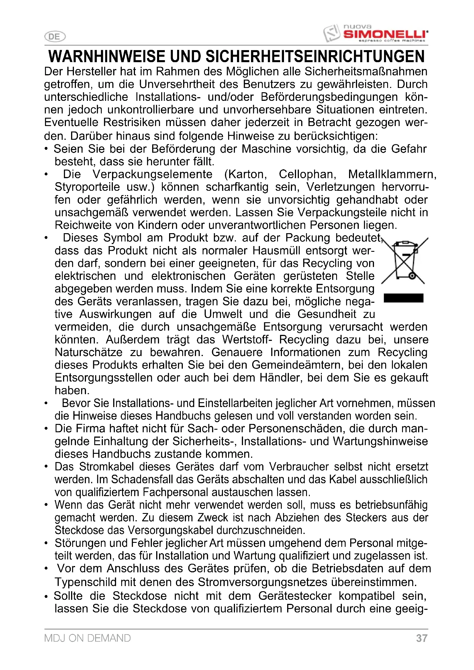 Dieses Handbuch ist für den Benutzer und/oder den Wartungstechniker der Maschine bestimmt und ist als wesentlicher Bestandteil derselben zu betrachten. Das vorliegende Handbuch hat den Zweck, Informationen zum korrekten Gebrauch und zur richtigen Wartung zu liefern und die Sicherheit des Bedieners zu wahren. Das Handbuch muss über die gesamte Standzeit der Maschine verwahrt werden und ist an jeden anderen Benutzer oder nachfolgenden Eigentümer weiter zu geben. Die im vorliegenden Handbuch gegebenen Hinweise ersetzen nicht die Sicherheitsangaben und die technischen Installations- und Betriebsdaten, die direkt an der Maschine und den Verpackungen angegeben sind. Das vorliegende Handbuch entspricht dem aktuellen Stand der Technik und kann nicht als unzureichend betrachtet werden, sofern es aufgrund neuer Erfahrungen später aktualisiert werden sollte. Der Hersteller behält sich darüber hinaus das Recht vor, das Handbuch ohne Verpflichtung zur Aktualisierung vorheriger Ausgaben zu ändern, es sei denn in Ausnahmefällen. Ein unsachgemäßer oder von den Angaben des vorliegenden Handbuchs abweichender Gebrauch der Maschine macht die Garantie hinfällig und schließt jegliche Haftung des Herstellers aus. Die Maschine muss durch eine erwachsene und verantwortungsbewusste Person bedient werden. Das vorliegende Handbuch muss sorgfältig aufbewahrt werden, da der Hersteller nicht für Personen-, Sach- oder Maschinenschäden haftet, die durch von den Angaben abweichende Verwendung bzw. Nichteinhaltung der Wartungs- und Sicherheitsvorschriften bedingt sind.