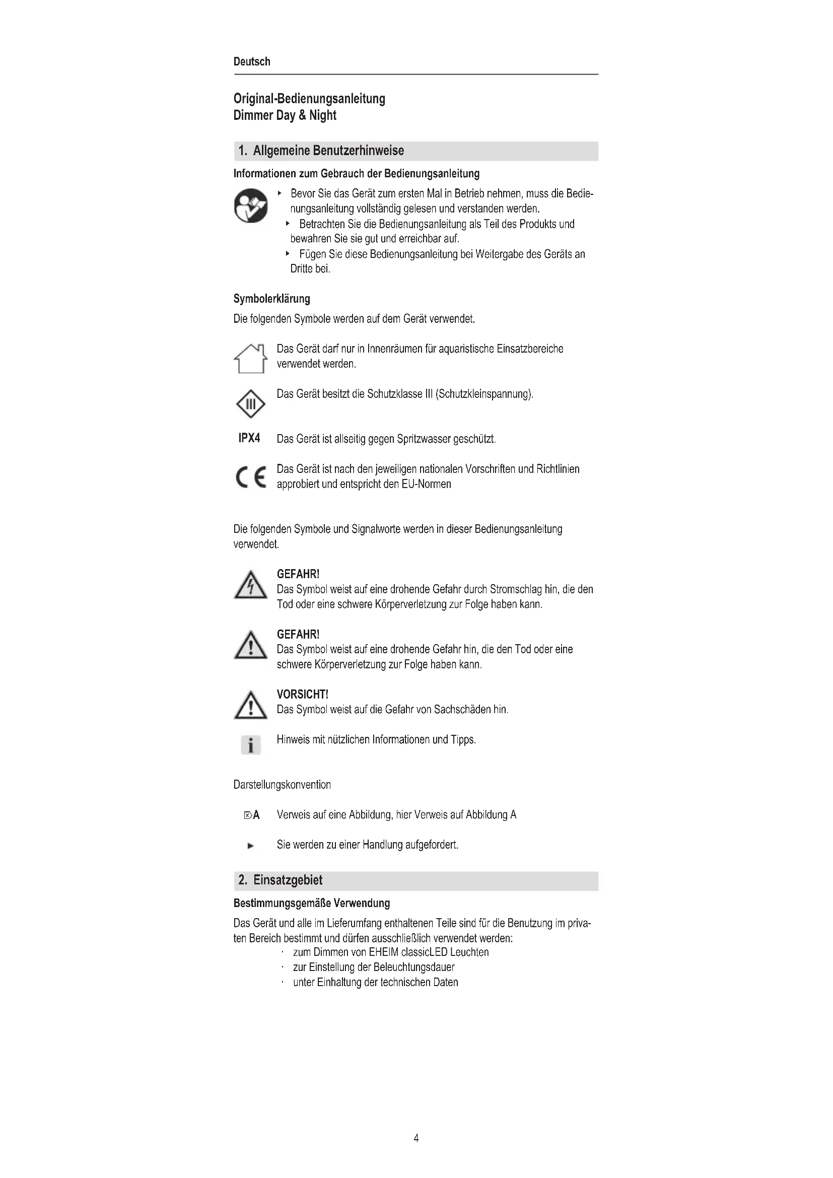 Bestimmungsgemäße Verwendung Das Gerät und alle im Lieferumfang enthaltenen Teile sind für die Benutzung im priva- ten Bereich bestimmt und dürfen ausschließlich verwendet werden: ‧ zum Dimmen von EHEIM classicLED Leuchten ‧ zur Einstellung der Beleuchtungsdauer ‧ unter Einhaltung der technischen Daten IPX4 ⌦ADeutsch