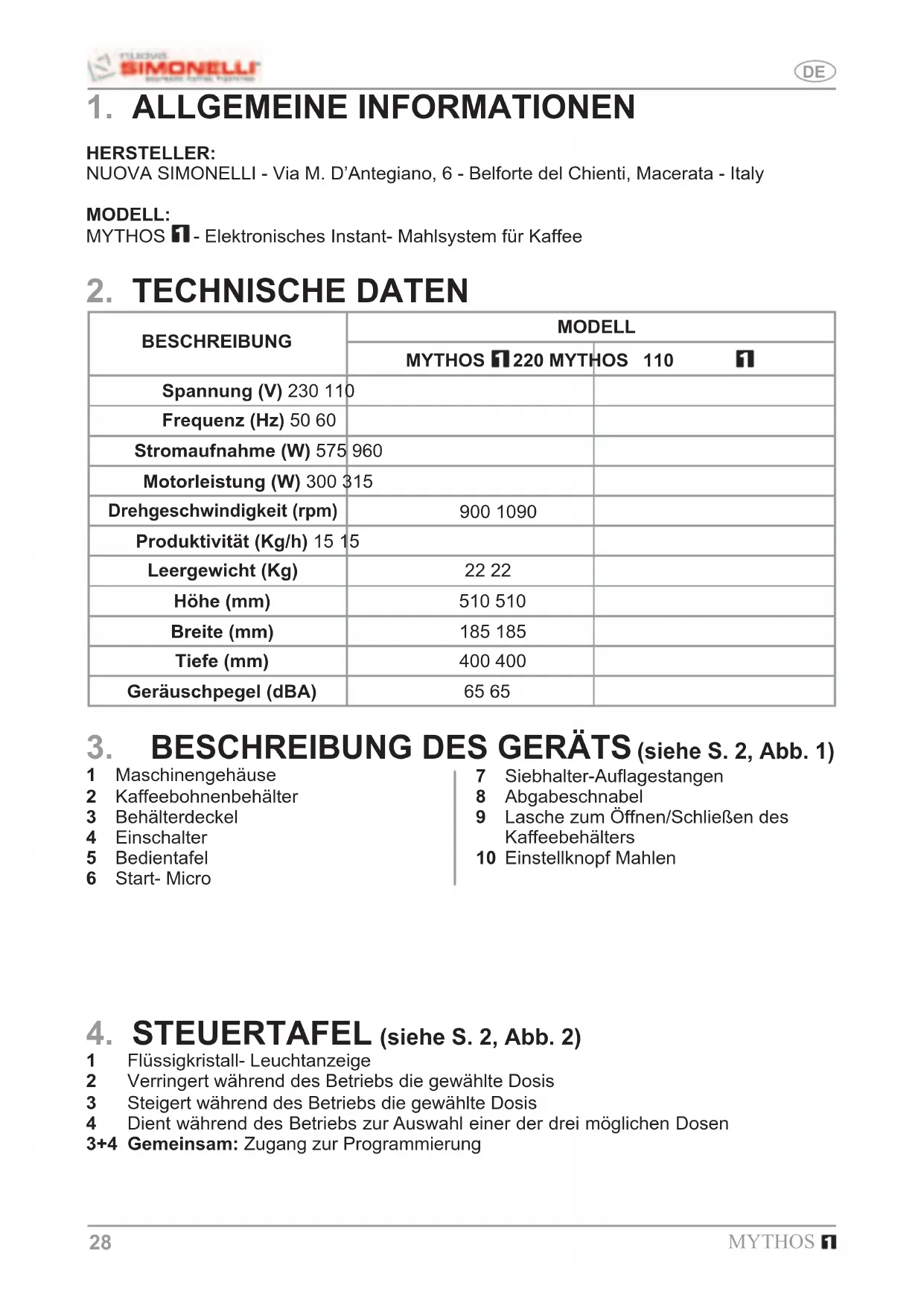 BESCHREIBUNG MODELL MYTHOS 220 MYTHOS 110 Spannung (V) 230 110 Frequenz (Hz) 50 60 Stromaufnahme (W) 575 960 Motorleistung (W) 300 315 Drehgeschwindigkeit (rpm)