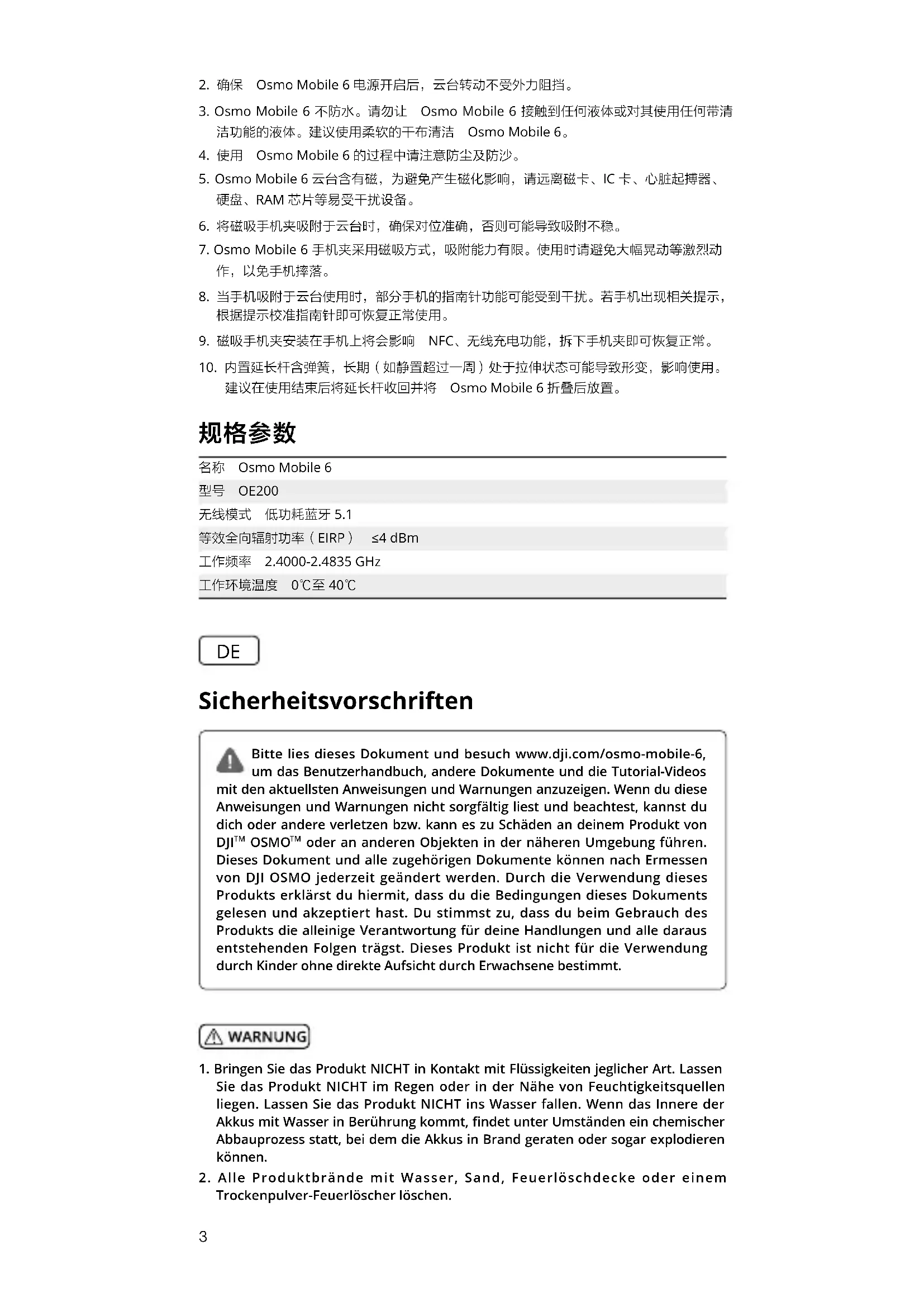 more than a week, the spring may become deformed and the extension rod can no longer be used normally. It is recommended to retract the extension rod and fold the gimbal after using. Specifications Name Osmo Mobile 6 Model OE200 Wireless Mode Bluetooth Low Energy 5.1 Transmission Power (EIRP) ≤4 dBm Operating Frequency 2.4000-2.4835 GHz Operating Temperature 0° to 40° CSicherheitsvorschriften Bitte lies dieses Dokument und besuch www.dji.com/osmo-mobile-6, um das Benutzerhandbuch, andere Dokumente und die Tutorial-Videos mit den aktuellsten Anweisungen und Warnungen anzuzeigen. Wenn du diese Anweisungen und Warnungen nicht sorgfältig liest und beachtest, kannst du dich oder andere verletzen bzw. kann es zu Schäden an deinem Produkt von DJI