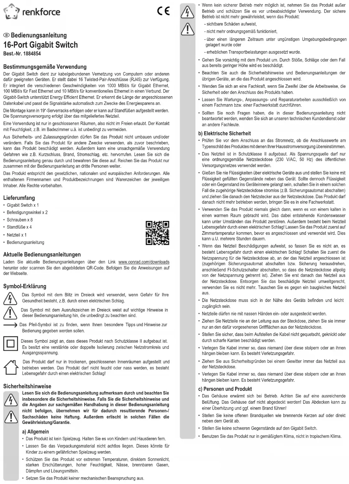 - Verwenden Sie ein trockenes, faserfreies Tuch zur Reinigung des Produkts. Drücken Sie nicht zu stark auf das Gehäuse, dies kann zu Kratzspuren führen.Entsorgung Elektronische Geräte sind Wertstoffe und gehören nicht in den Hausmüll. Entsorgen Sie das Produkt am Ende seiner Lebensdauer gemäß den geltenden gesetzlichen Bestimmungen. Sie erfüllen damit die gesetzlichen Verpichtungen und leisten Ihren Beitrag zum Umweltschutz. Technische Daten a) Switch Eingangsspannung/-strom ............ 12 V/DC / max. 1 A Anschlüsse ................................... 16 x Ethernet-Port (10/100/1000 MBit/s Auto-Negotiation) Auto-MDI/MDI-X für jeden Port Systemvoraussetzungen .............. Windows