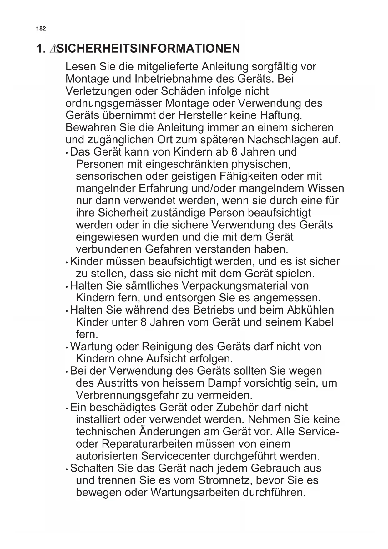 - Schalten Sie das Gerät nach jedem Gebrauch aus und trennen Sie es vom Stromnetz, bevor Sie es bewegen oder Wartungsarbeiten durchführen. 1821. SICHERHEITSINFORMATIONEN Lesen Sie die mitgelieferte Anleitung sorgfältig vor Montage und Inbetriebnahme des Geräts. Bei Verletzungen oder Schäden infolge nicht ordnungsgemässer Montage oder Verwendung des Geräts übernimmt der Hersteller keine Haftung. Bewahren Sie die Anleitung immer an einem sicheren und zugänglichen Ort zum späteren Nachschlagen auf.