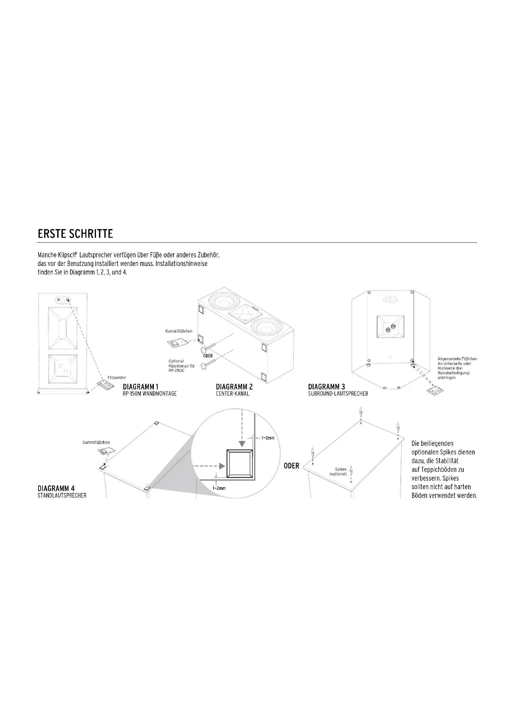 Abgerundete Füßchen An Unterseite oder Rückseite (bei Wandbefestigung) anbringen DIAGRAMM 2 CENTER-KANAL DIAGRAMM 3 SURROUND-LAUTSPRECHER Filzpolster GummifüßchenGummifüßchenOptional Kippstange für RP-250C ODER Die beiliegenden optionalen Spikes dienen dazu, die Stabilität auf Teppichböden zu verbessern. Spikes sollten nicht auf harten Böden verwendet werden. DIAGRAMM 4 STANDLAUTSPRECHER ODER 1~2mm 1~2mmAUFSTELLUNG IM RAUM ANSCHLÜSSE Linke und rechte Hauptkanal-Lautsprecher – Zur optimalen Leistung empfiehlt Klipsch Group, Inc. (KGI), dass Sie die Lautsprecher 1,8 bis 4,6 m voneinander entfernt und mindestens 61 cm von den Rück- und Seitenwänden aufstellen. Um ein besseres Stereoklangbild zu erhalten, sollten Sie sie eventuell etwas nach innen ausrichten. Der Abstand der Hörpositionen sollte etwa 1 bis 1,5 mal so groß wie der Abstand der Lautsprecher voneinander sein. Abbildungen 1 und 3 zeigen Ihnen die korrekten Anschlüsse und Platzierungen. Center-Kanal-Lautsprecher – Center-Kanal-Lautsprecher dienen dazu, Dialog und primären Sound so wiederzugeben, dass sie vom Videobildschirm zu kommen scheinen. Diese Lautsprecher sollten deshalb so nahe wie möglich am Bildschirm platziert werden, am besten direkt über oder unter dem Bildschirm. Abbildungen 1, 2 und 3 zeigen Ihnen die korrekten Anschlüsse und Platzierungen. Hintere Surround-Lautsprecher – Klipsch WDST Surround-Lautsprecher sollten ungefähr 60 cm über der Hörposition platziert werden. Normalerweise ist das 1,5-2 m über dem Boden. Die Surround-Lautsprecher sollten an Wänden und in unmittelbarer Nähe der Hörposition platziert werden. Eine weitere Option wäre die Wand hinter der Hörposition. Letztlich hängt die Platzierung des Surround- Lautsprechers von den Eigenschaften Ihres Raums ab. Die Lautsprecher erzeugen den durch die moderne Surround-Sound-Technologie ermöglichten Raumklang. Abbildungen 1, 3 und 4 zeigen Ihnen die korrekten Anschlüsse und Platzierungen. Konventioneller Anschluss – Verwenden Sie 16-Gauge-Lautsprecherkabel (oder dicker) und verbinden Sie den ROTEN, positiven (+) Anschluss des LINKEN Lautsprechers mit dem ROTEN, positiven (+) Anschluss des LINKEN Kanals Ihres Verstärkers. Verbinden Sie den SCHWARZEN, negativen (-) Anschluss des LINKEN Lautsprechers mit dem SCHWARZEN, negativen (-) Anschluss des LINKEN Kanals Ihres Verstärkers. Wiederholen Sie dieses Verfahren für den Anschluss aller verbleibenden Lautsprecher an die entsprechenden Verstärkerkanäle. Siehe Abbildung 3. Vergewissern Sie sich, dass kein blanker Draht von einem der Anschlüsse andere Klemmen berührt, da dies einen Kurzschluss hervorrufen und Ihre Geräte beschädigen könnte. Die Reference Premiere-Modelle RP-280F, RP-260F, RP-250F und RP-160M verfügen über doppelte Anschlussterminals . Wenn eine Einkabel-Verbindung benutzt wird, sollte der Verbindungsstreifen an Ort und Stelle bleiben. Bei einer Bi-Wiring- oder Bi-Amping- Verbindung musst der Verbindungsstreifen entfernt werden. Weitere Anleitungen hierzu finden Sie in der Dokumentation Ihres Receivers. Verstärkeranforderungen – Klipsch-Lautsprecher haben einen hohen Wirkungsgrad und können mit zahlreichen Verstärkern betrieben werden. Alle Klipsch-Lautsprecher sind 8-Ohm-kompatibel und können hohe Schallpegel mit geringer Verzerrung wiedergeben. Aufgrund des hohen Ausgangspegels, den Klipsch-Lautsprecher wiedergeben können, sollten Sie den Lautstärkeregler mit Bedacht einsetzen. Übermäßige Lautstärke über längere Zeiträume hinweg kann Ihr Hörvermögen permanent schädigen. Eine Überbelastung Ihres Verstärkers kann auch die Lautsprecher beschädigen. Fragen Sie Ihren Fachhändler, ob Ihr Verstärker für Ihren Einsatzzweck geeignet ist. Wir wollen, dass Sie einen lebenslangen Hörgenuss haben.SUB SUBTVCXYZsLsRsLsRX=Y=ZL R Front Right Front Left SUB SUBTV XYZ