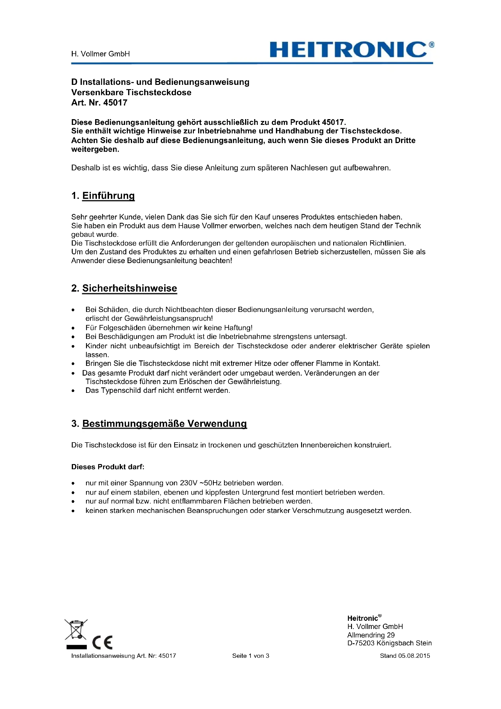 H. Vollmer GmbH Installationsanweisung Art. Nr: 45017 Seite 1 von 3 Stand 05.08.2015 D Installations- und Bedienungsanweisung Versenkbare Tischsteckdose Art. Nr. 45017 Diese Bedienungsanleitung gehört ausschließlich zu dem Produkt 45017. Sie enthält wichtige Hinweise zur Inbetriebnahme und Handhabung der Tischsteckdose. Achten Sie deshalb auf diese Bedienungsanleitung, auch wenn Sie dieses Produkt an Dritte weitergeben. Deshalb ist es wichtig, dass Sie diese Anleitung zum späteren Nachlesen gut aufbewahren.