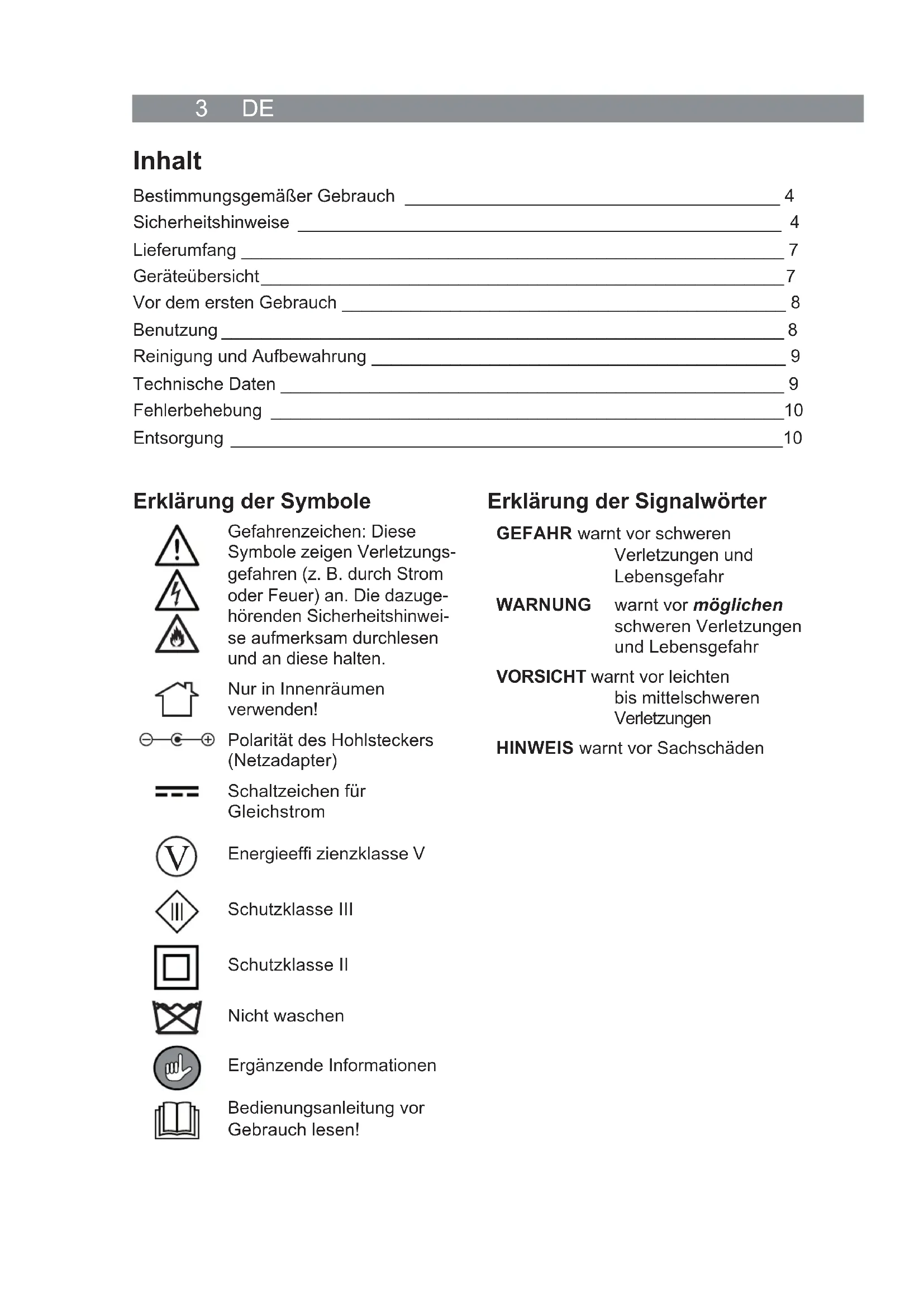 Handleiding vanaf pagina 273 DE Inhalt Bestimmungsgemäßer Gebrauch ______________________________________ 4 Sicherheitshinweise _________________________________________________ 4 Lieferumfang _______________________________________________________ 7 Geräteübersicht _____________________________________________________ 7 Vor dem ersten Gebrauch _____________________________________________ 8 Benutzung _________________________________________________________ 8 Reinigung und Aufbewahrung __________________________________________ 9 Technische Daten ___________________________________________________ 9 Fehlerbehebung ____________________________________________________10 Entsorgung ________________________________________________________10 Erklärung der Symbole Gefahrenzeichen: Diese Symbole zeigen Verletzungs- gefahren (z. B. durch Strom oder Feuer) an. Die dazuge- hörenden Sicherheitshinwei- se aufmerksam durchlesen und an diese halten. Nur in Innenräumen verwenden! Polarität des Hohlsteckers (Netzadapter) Schaltzeichen für Gleichstrom