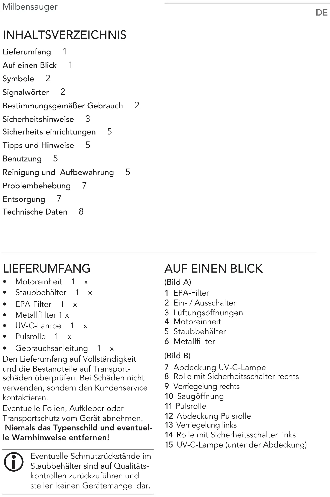 (Bild A) 1 EPA-Filter 2 Ein- / Ausschalter 3 Lüftungsöffnungen 4 Motoreinheit 5 Staubbehälter 6 Metallfi lter (Bild B) 7 Abdeckung UV-C-Lampe 8 Rolle mit Sicherheitsschalter rechts 9 Verriegelung rechts 10 Saugöffnung 11 Pulsrolle 12 Abdeckung Pulsrolle 13 Verriegelung links 14 Rolle mit Sicherheitsschalter links 15 UV-C-Lampe (unter der Abdeckung) INHALTSVERZEICHNIS Lieferumfang 1 Auf einen Blick 1 Symbole 2 Signalwörter 2 Bestimmungsgemäßer Gebrauch 2 Sicherheitshinweise 3 Sicherheits einrichtungen 5 Tipps und Hinweise 5 Benutzung 5 Reinigung und Aufbewahrung 5 Problembehebung 7 Entsorgung 7 Technische Daten 8DE