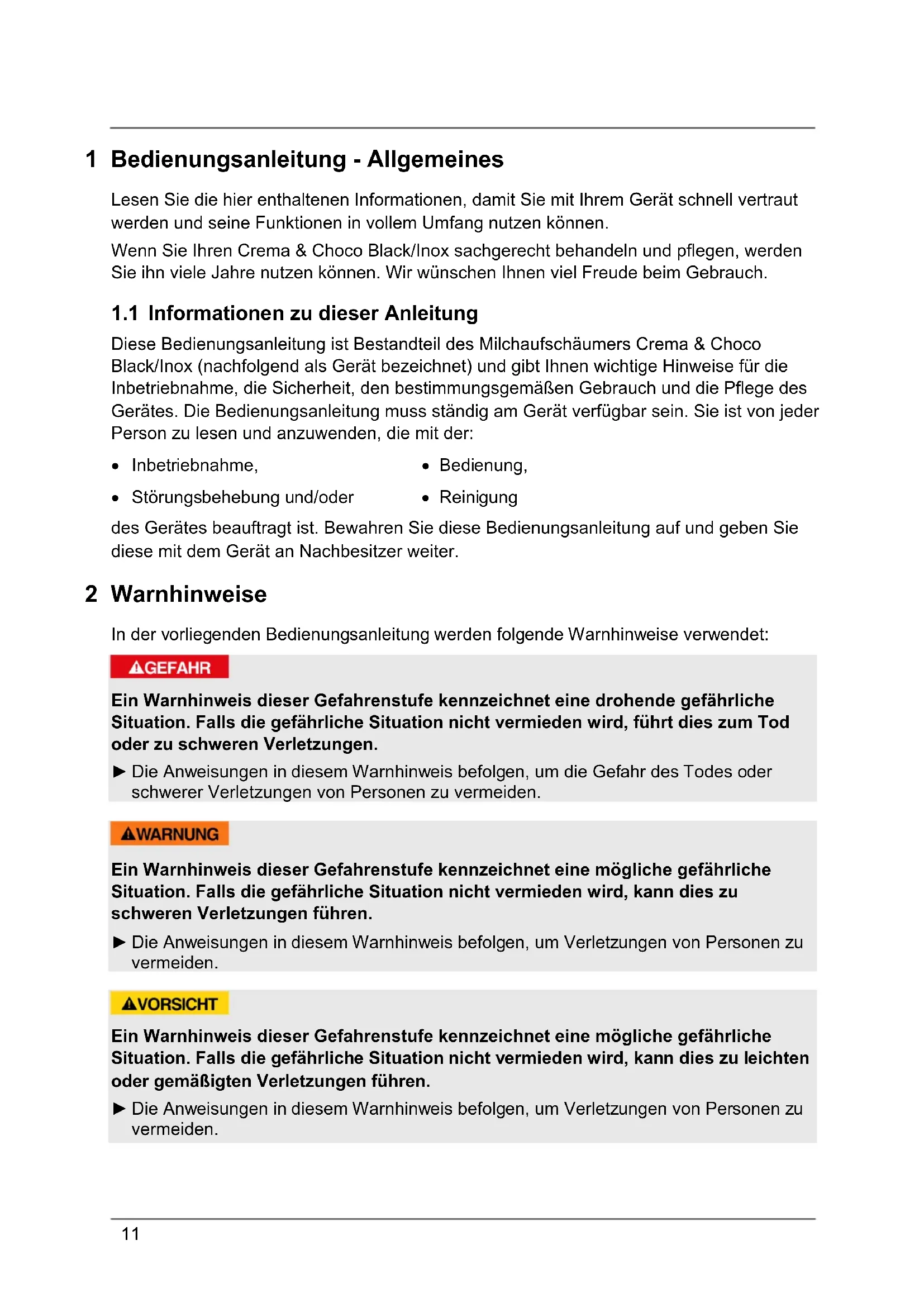 Diese Bedienungsanleitung ist Bestandteil des Milchaufschäumers Crema & Choco Black/Inox (nachfolgend als Gerät bezeichnet) und gibt Ihnen wichtige Hinweise für die Inbetriebnahme, die Sicherheit, den bestimmungsgemäßen Gebrauch und die Pflege des Gerätes. Die Bedienungsanleitung muss ständig am Gerät verfügbar sein. Sie ist von jeder Person zu lesen und anzuwenden, die mit der: