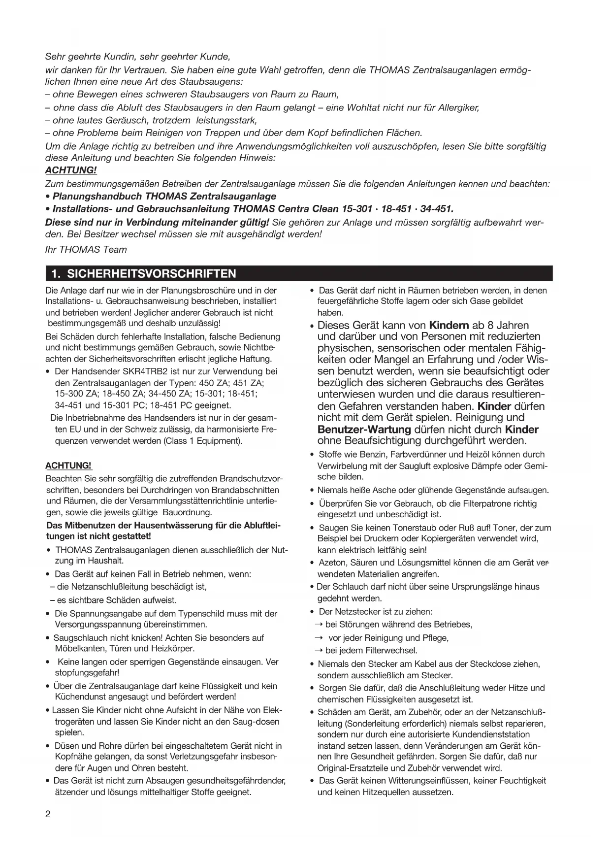 - Installations- und Gebrauchsanleitung THOMAS Centra Clean 15-301 · 18-451 · 34-451. Diese sind nur in Verbindung miteinander gültig! Sie gehören zur Anlage und müssen sorgfältig aufbewahrt wer- den. Bei Besitzer wechsel müssen sie mit ausgehändigt werden! Ihr THOMAS Team