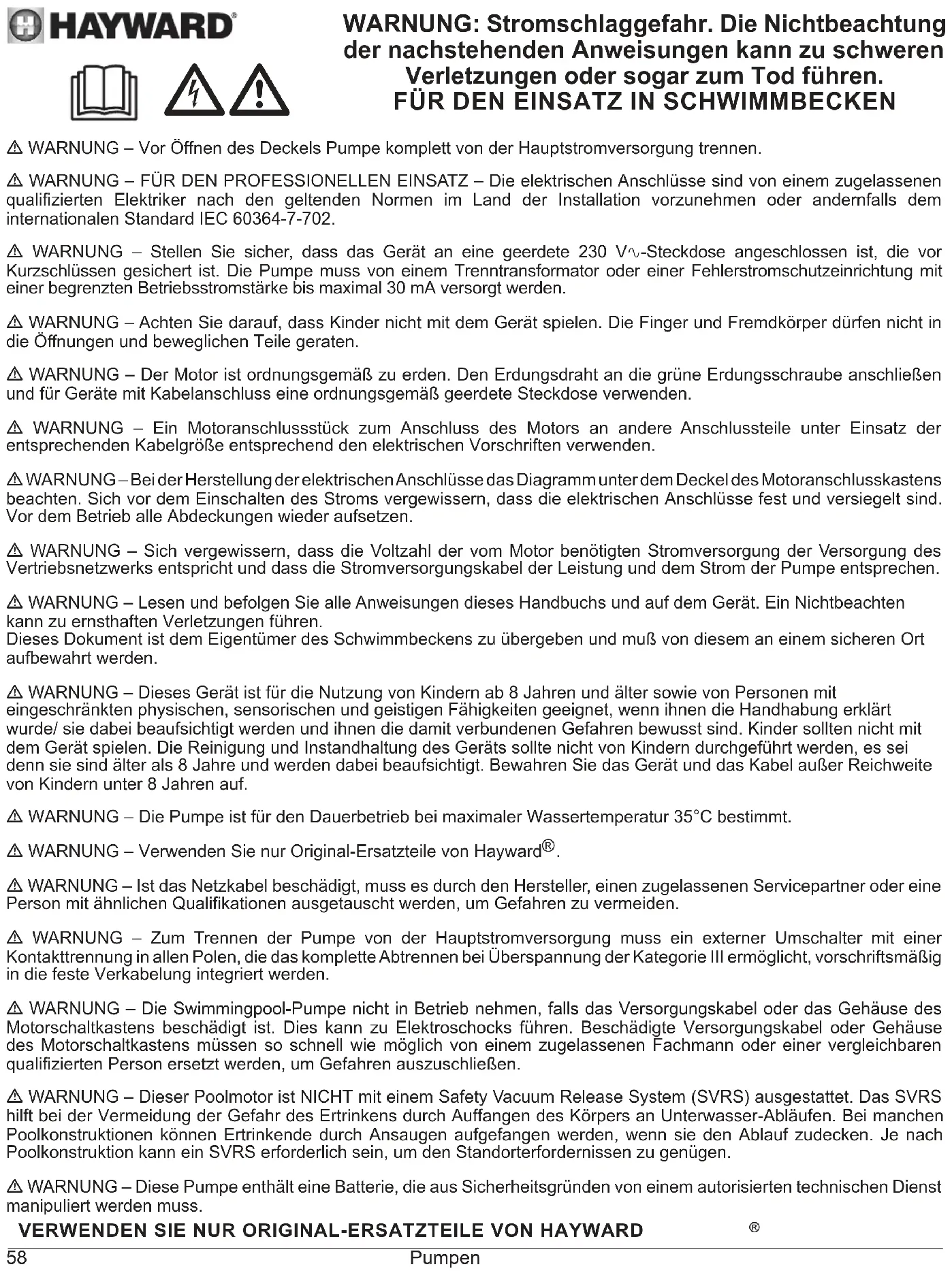 - WARNUNG – Dieser Poolmotor ist NICHT mit einem Safety Vacuum Release System (SVRS) ausgestattet. Das SVRS hilft bei der Vermeidung der Gefahr des Ertrinkens durch Auffangen des Körpers an Unterwasser-Abläufen. Bei manchen Poolkonstruktionen können Ertrinkende durch Ansaugen aufgefangen werden, wenn sie den Ablauf zudecken. Je nach Poolkonstruktion kann ein SVRS erforderlich sein, um den Standorterfordernissen zu genügen.