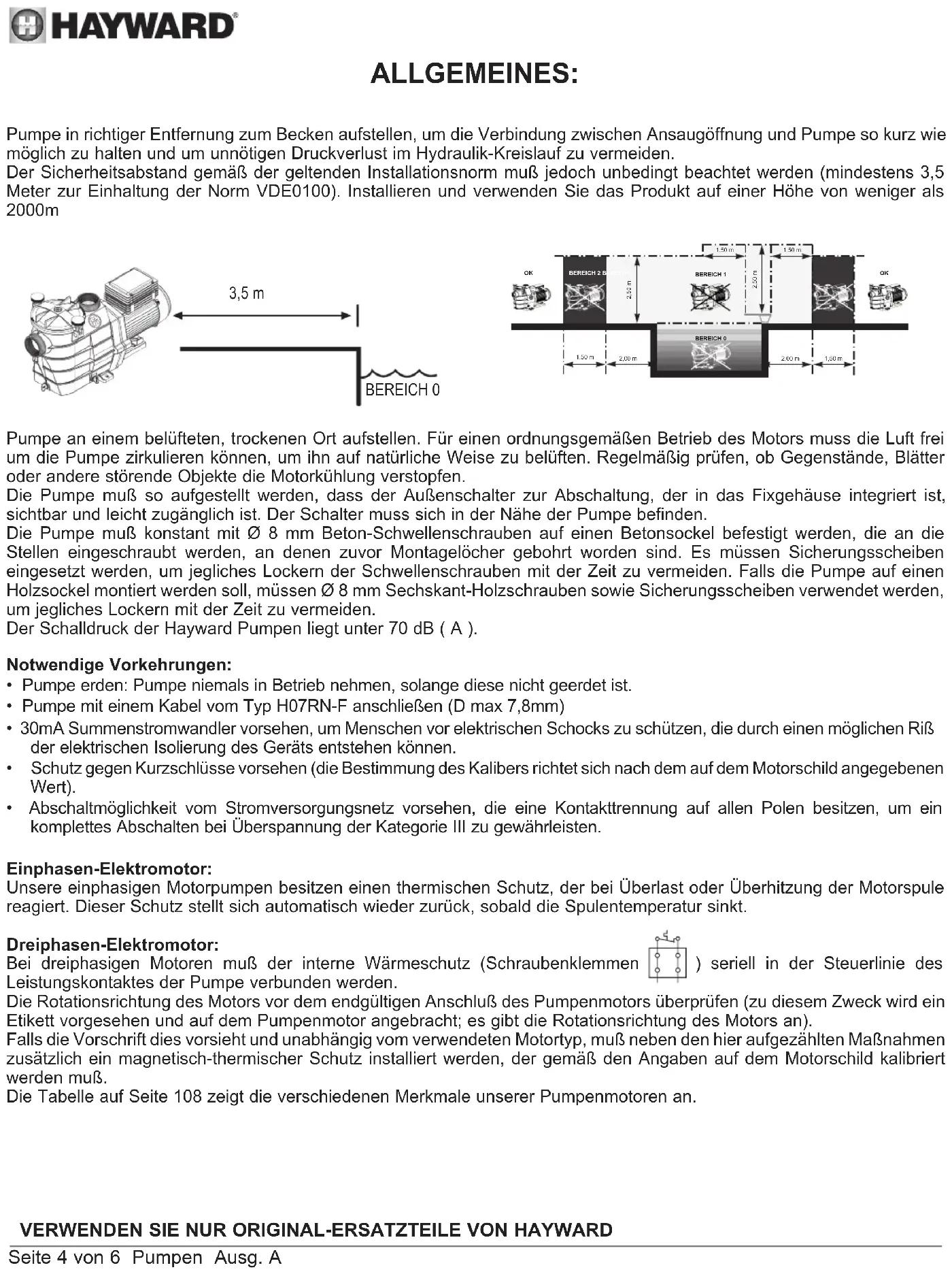 3,5 m BEREICH 0 Pumpe an einem belüfteten, trockenen Ort aufstellen. Für einen ordnungsgemäßen Betrieb des Motors muss die Luft frei um die Pumpe zirkulieren können, um ihn auf natürliche Weise zu belüften. Regelmäßig prüfen, ob Gegenstände, Blätter oder andere störende Objekte die Motorkühlung verstopfen. Die Pumpe muß so aufgestellt werden, dass der Außenschalter zur Abschaltung, der in das Fixgehäuse integriert ist, sichtbar und leicht zugänglich ist. Der Schalter muss sich in der Nähe der Pumpe befinden. Die Pumpe muß konstant mit Ø 8 mm Beton-Schwellenschrauben auf einen Betonsockel befestigt werden, die an die Stellen eingeschraubt werden, an denen zuvor Montagelöcher gebohrt worden sind. Es müssen Sicherungsscheiben eingesetzt werden, um jegliches Lockern der Schwellenschrauben mit der Zeit zu vermeiden. Falls die Pumpe auf einen Holzsockel montiert werden soll, müssen Ø 8 mm Sechskant-Holzschrauben sowie Sicherungsscheiben verwendet werden, um jegliches Lockern mit der Zeit zu vermeiden. Der Schalldruck der Hayward Pumpen liegt unter 70 dB ( A ). Notwendige Vorkehrungen: