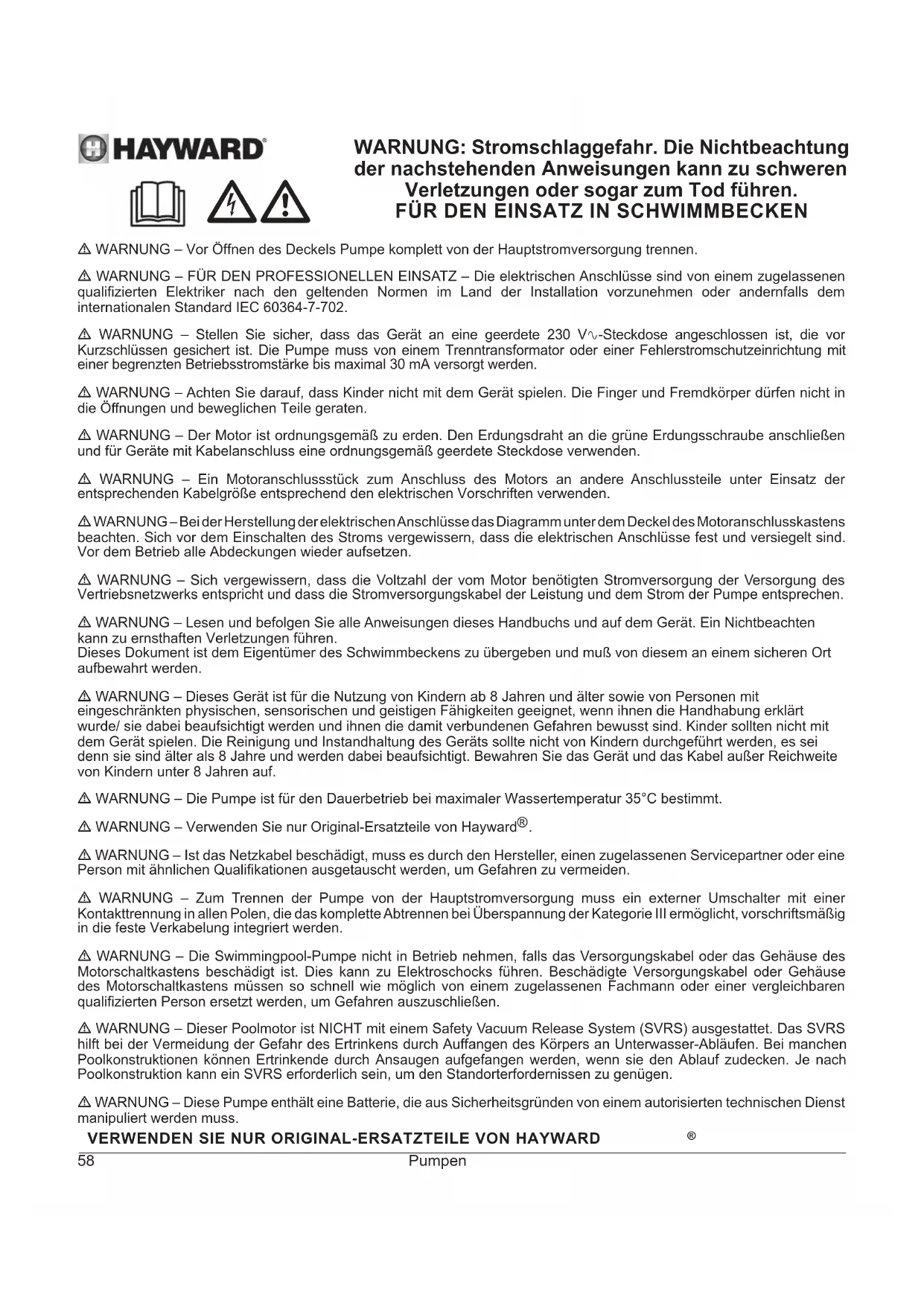- WARNUNG – Verwenden Sie nur Original-Ersatzteile von Hayward