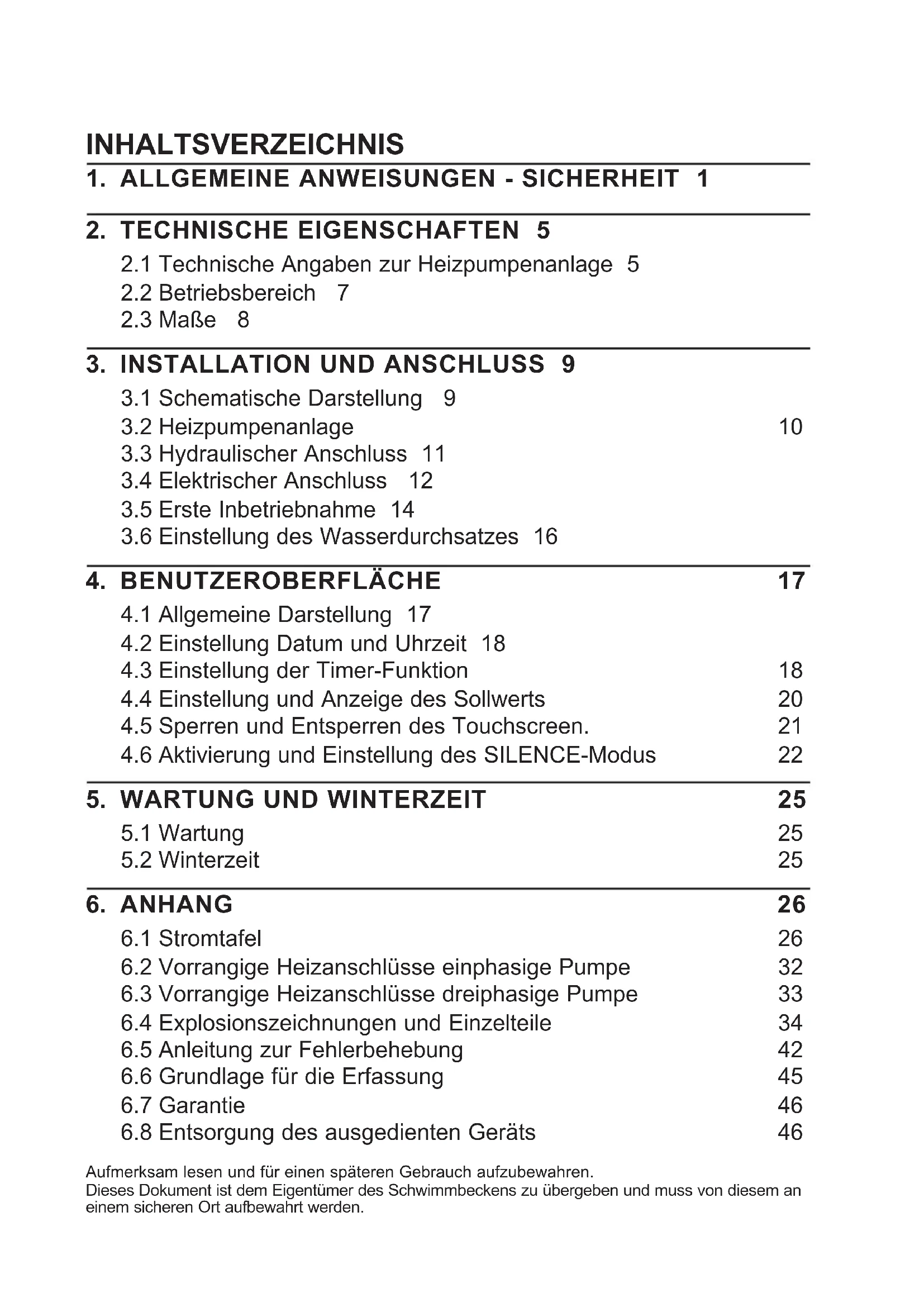 - Decken Sie die Heizpumpenanlage mit der für diesen Zweck vorgesehenen Winterschutzhülle ab. Jeglicher Schaden, der durch eine schlechte Winterlagerung entsteht, hebt alle Garantieansprüche auf. Benutzungsbedingungen Mindestens 8 Jahre alte Kindern, Personen mit eingeschränkten körperlichen, sensorischen oder geistigen Fähigkeiten oder Personen mit mangelnder Erfahrung und mangelnden Kenntnissen können dieses Gerät verwenden, soweit sie hierbei hinreichend überwacht werden, oder Anweisungen zur sicheren Verwendung des Geräts erhalten haben und damit verbundene Risiken berücksichtigt wurden.Kinder dürfen nicht mit dem Gerät spielen. Vom Benutzer durchführbare Reinigungs- und Wartungsmaßnahmen dürfen nicht ohne Überwachung von Kindern vorgenommen werden.5