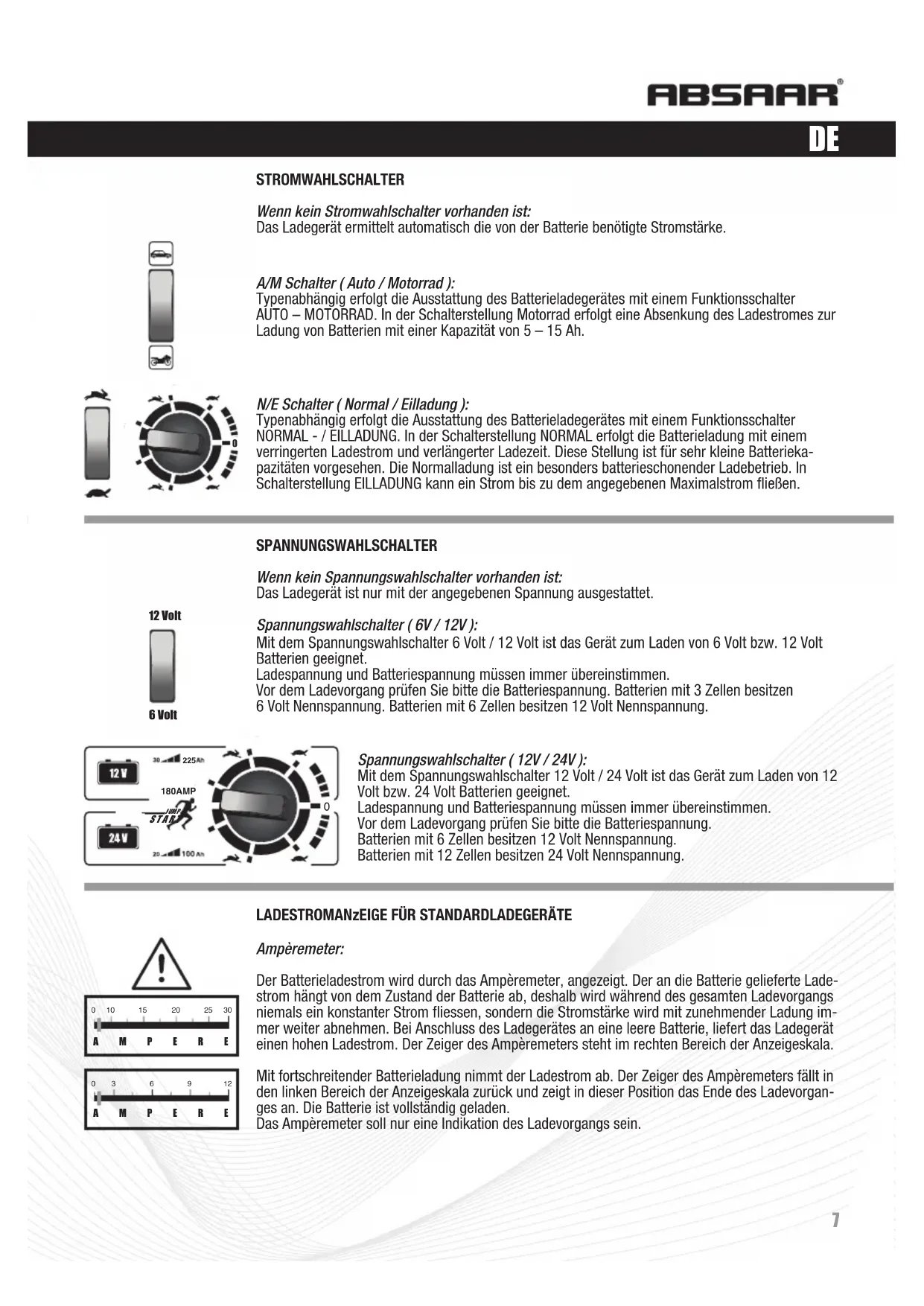 SPANNUNGSWAHLSCHALTER Wenn kein Spannungswahlschalter vorhanden ist: Das Ladegerät ist nur mit der angegebenen Spannung ausgestattet. Spannungswahlschalter ( 6V / 12V ): Mit dem Spannungswahlschalter 6 Volt / 12 Volt ist das Gerät zum Laden von 6 Volt bzw. 12 Volt Batterien geeignet. Ladespannung und Batteriespannung müssen immer übereinstimmen. Vor dem Ladevorgang prüfen Sie bitte die Batteriespannung. Batterien mit 3 Zellen besitzen 6 Volt Nennspannung. Batterien mit 6 Zellen besitzen 12 Volt Nennspannung. Spannungswahlschalter ( 12V / 24V ): Mit dem Spannungswahlschalter 12 Volt / 24 Volt ist das Gerät zum Laden von 12 Volt bzw. 24 Volt Batterien geeignet. Ladespannung und Batteriespannung müssen immer übereinstimmen. Vor dem Ladevorgang prüfen Sie bitte die Batteriespannung. Batterien mit 6 Zellen besitzen 12 Volt Nennspannung. Batterien mit 12 Zellen besitzen 24 Volt Nennspannung.