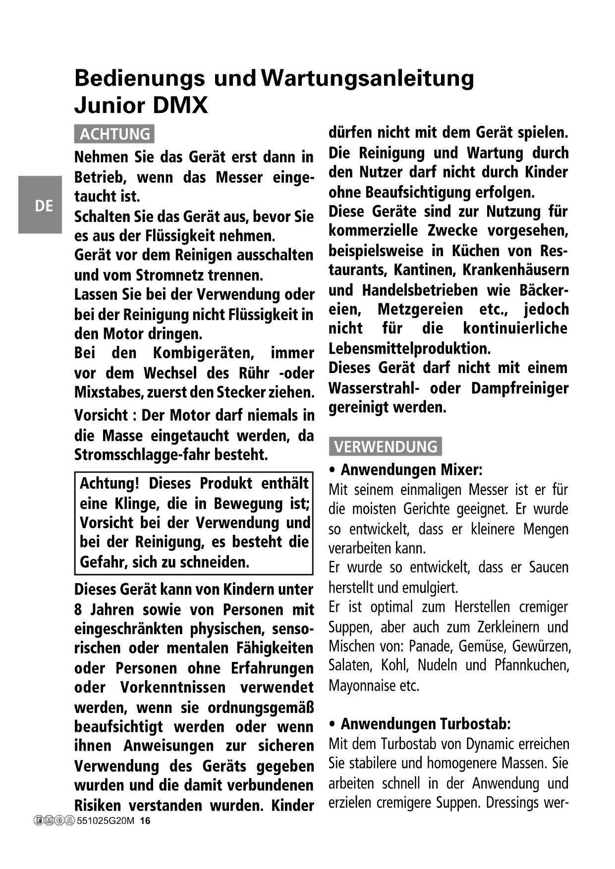 - Instructions pour la réparation de votre appareil : Si votre appareil ne fonctionne plus norma- lement, veuillez demander conseil à votre revendeur qui, souvent, pourra y porter remède ou autrement, veuillez expédier cet appareil, sous emballage très solide à : DYNAMIC FRANCE S.A.S. 518 rue Léo Baekeland - B.P.57 85290 Mortagne-sur-Sèvre - FRANCE Tout retour d’appareil doit être effectué en Port payé. 551025G20M 15DE ACHTUNG Nehmen Sie das Gerät erst dann in Betrieb, wenn das Messer einge- taucht ist. Schalten Sie das Gerät aus, bevor Sie es aus der Flüssigkeit nehmen. Gerät vor dem Reinigen ausschalten und vom Stromnetz trennen. Lassen Sie bei der Verwendung oder bei der Reinigung nicht Flüssigkeit in den Motor dringen. Bei den Kombigeräten, immer vor dem Wechsel des Rühr -oder Mixstabes, zuerst den Stecker ziehen. Vorsicht : Der Motor darf niemals in die Masse eingetaucht werden, da Stromsschlagge-fahr besteht. Achtung! Dieses Produkt enthält eine Klinge, die in Bewegung ist; Vorsicht bei der Verwendung und bei der Reinigung, es besteht die Gefahr, sich zu schneiden. Dieses Gerät kann von Kindern unter 8 Jahren sowie von Personen mit eingeschränkten physischen, senso- rischen oder mentalen Fähigkeiten oder Personen ohne Erfahrungen oder Vorkenntnissen verwendet werden, wenn sie ordnungsgemäß beaufsichtigt werden oder wenn ihnen Anweisungen zur sicheren Verwendung des Geräts gegeben wurden und die damit verbundenen Risiken verstanden wurden. Kinder dürfen nicht mit dem Gerät spielen. Die Reinigung und Wartung durch den Nutzer darf nicht durch Kinder ohne Beaufsichtigung erfolgen. Diese Geräte sind zur Nutzung für kommerzielle Zwecke vorgesehen, beispielsweise in Küchen von Res- taurants, Kantinen, Krankenhäusern und Handelsbetrieben wie Bäcker- eien, Metzgereien etc., jedoch nicht für die kontinuierliche Lebensmittelproduktion. Dieses Gerät darf nicht mit einem Wasserstrahl- oder Dampfreiniger gereinigt werden. VERWENDUNG