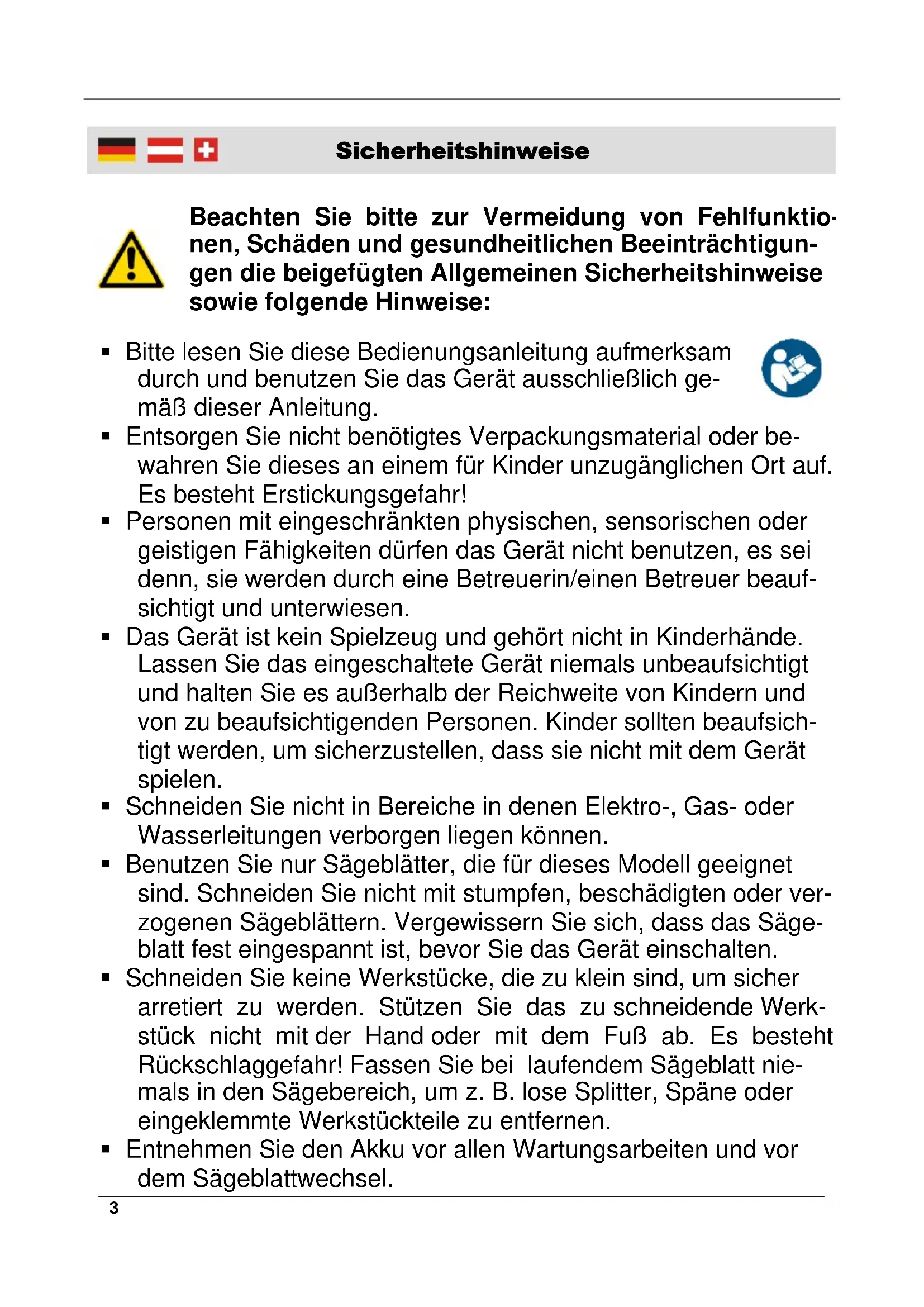 Parallelanschlag Parallel Guide Übersicht | Overview1 Sicherheitshinweise ................................................................ Seite 3 Vor der ersten Benutzung ....................................................... Seite 7 Vorbereiten des Ladegerätes.................................................. Seite 7 Aufladen des Akkus ................................................................ Seite 7 Akku-Ladestand ..................................................................... Seite 8 Weitere Hinweise zum Laden des Akkus ................................ Seite 8 Einsetzen und Entnehmen des Akkus .................................... Seite 9 Einsetzen des Sägeblattes ..................................................... Seite 9 EIN/AUS-Schalter ................................................................... Seite 10 Einstellen des Pendelhubs ..................................................... Seite 10 Schrägschnitt .......................................................................... Seite 10 Staubabsaugung .................................................................... Seite 11 Saug-/Blasfunktionshebel ....................................................... Seite 11 Parallelanschlag ..................................................................... Seite 11 Entsorgen von Akkus .............................................................. Seite 12 Wartung, Reinigung und Lagerung ......................................... Seite 12 Typen von Sägeblättern .......................................................... Seite 13 Technische Daten ................................................................... Seite 14 Inhaltsverzeichnis2 Safety Notes ........................................................................... Page 16 Before first Use....................................................................... Page 20 Setting up the Battery Charger ............................................... Page 20 Charging the Battery .............................................................. Page 20 Battery Charge Level .............................................................. Page 21 Notes about Battery Charging ................................................ Page 21 Inserting and Removing the Battery Pack ............................... Page 22 Inserting the Saw Blade .......................................................... Page 22 Turning ON/OFF ..................................................................... Page 22 Adjusting the Pendulum Stroke .............................................. Page 22 Making Bevel Cuts ................................................................. Page 23 Dust Extraction ....................................................................... Page 23 Dust Collection/Blowing Function Lever.................................. Page 24 Parallel Guide ......................................................................... Page 24 Battery Disposal ..................................................................... Page 24 Maintenance, Cleaning and Storing ........................................ Page 24 Saw Blade Types ................................................................... Page 26 Technical Data ....................................................................... Page 27 Table of Contents3 Sicherheitshinweise Bitte lesen Sie diese Bedienungsanleitung aufmerksam durch und benutzen Sie das Gerät ausschließlich ge- mäß dieser Anleitung. Entsorgen Sie nicht benötigtes Verpackungsmaterial oder be- wahren Sie dieses an einem für Kinder unzugänglichen Ort auf. Es besteht Erstickungsgefahr! Personen mit eingeschränkten physischen, sensorischen oder geistigen Fähigkeiten dürfen das Gerät nicht benutzen, es sei denn, sie werden durch eine Betreuerin/einen Betreuer beauf- sichtigt und unterwiesen. Das Gerät ist kein Spielzeug und gehört nicht in Kinderhände. Lassen Sie das eingeschaltete Gerät niemals unbeaufsichtigt und halten Sie es außerhalb der Reichweite von Kindern und von zu beaufsichtigenden Personen. Kinder sollten beaufsich- tigt werden, um sicherzustellen, dass sie nicht mit dem Gerät spielen. Schneiden Sie nicht in Bereiche in denen Elektro-, Gas- oder Wasserleitungen verborgen liegen können. Benutzen Sie nur Sägeblätter, die für dieses Modell geeignet sind. Schneiden Sie nicht mit stumpfen, beschädigten oder ver- zogenen Sägeblättern. Vergewissern Sie sich, dass das Säge- blatt fest eingespannt ist, bevor Sie das Gerät einschalten. Schneiden Sie keine Werkstücke, die zu klein sind, um sicher arretiert zu werden. Stützen Sie das zu schneidende Werk- stück nicht mit der Hand oder mit dem Fuß ab. Es besteht Rückschlaggefahr! Fassen Sie bei laufendem Sägeblatt nie- mals in den Sägebereich, um z. B. lose Splitter, Späne oder eingeklemmte Werkstückteile zu entfernen. Entnehmen Sie den Akku vor allen Wartungsarbeiten und vor dem Sägeblattwechsel.