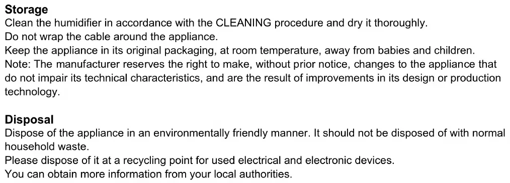 Fault-handling methods Problem Solution Humidifier doesn’t work at all Make sure it is properly plugged into the power-supply socket. Switch on using the button on the back of the appliance. There is a strange odour Clean the water tank with a vinegar/water mix. Leave the water tank open without its cover for a while. Not much mist Clean the atomiser. If the water has been in the unit for a long time, replace it with clean water.Storage Clean the humidifier in accordance with the CLEANING procedure and dry it thoroughly. Do not wrap the cable around the appliance. Keep the appliance in its original packaging, at room temperature, away from babies and children. Note: The manufacturer reserves the right to make, without prior notice, changes to the appliance that do not impair its technical characteristics, and are the result of improvements in its design or production technology. Disposal Dispose of the appliance in an environmentally friendly manner. It should not be disposed of with normal household waste. Please dispose of it at a recycling point for used electrical and electronic devices. You can obtain more information from your local authorities.(DE) Lieber Kunde, vielen Dank, dass Sie sich für unser Produkt entschieden haben! Technische Merkmale l Spannung: 100 - 240 V l Frequenz: 50 Hz l Leistung: 25W l Kapazität: 2.7L l Anwendung: 20 - 35 Quadratmeter l Tragbar Empfehlung l Bitte überprüfen Sie zuerst den Luftbefeuchter und melden Sie eventuelle Schäden sofort dem Verkäufer. l Stellen Sie sicher, dass die Versorgungsspannung mit der auf dem Typenschild des Geräts übereinstimmt. l Das Gerät sollte auf einer ebenen, harten Oberfläche ohne Hindernisse wie Teppiche oder Handtücher aufgestellt werden. Achten Sie außerdem darauf, dass über dem Gerät mindestens 60 cm Freiraum für den Nebelaustritt vorhanden sind. l Verwenden Sie das Gerät nicht, wenn es nicht vollständig montiert ist oder wenn Teile des Geräts fehlen. l Verwenden Sie für den Betrieb des Luftbefeuchters nur destilliertes Wasser. Eine Essig-Wasser- Mischung sollte nur zur Reinigung verwendet werden. l Die Wassertemperatur sollte 38 °C nicht überschreiten. l Die beste Betriebsumgebung hat eine Temperatur zwischen 15 °C und 38°C sowie eine Luftfeuchtigkeit von weniger als 80 % RH. l Stellen Sie das Gerät nicht in direktes Sonnenlicht. l Stellen Sie das Gerät nicht in der Nähe von Computern oder empfindlichen, elektronischen Geräten auf. l Verwenden Sie das Gerät nicht in Räumen mit explosiven Gasen oder während der Verwendung von brennbaren Lösungsmitteln, Lacken oder Klebstoffen. l Es wird nicht empfohlen, das Gerät unter Klimaanlagen zu stellen, da dies die Luftfeuchtigkeit beeinträchtigen kann. l Ziehen Sie nicht am Netzkabel, um das Gerät vom Stromnetz zu trennen. l Verwenden Sie das Gerät nicht, wenn es selbst oder dessen Kabel/Stecker beschädigt ist. l Bedienen Sie das Gerät nicht mit nassen Händen. l Stellen Sie kein heißes Wasser in den Wassertank. Füllen Sie nur Wasser durch den Boden des Tanks, nicht durch die Nebeldüse. l Fügen Sie dem Wasser keine aromatischen Substanzen hinzu (Pulver, Flüssigkeiten, Öl, usw.). Geben Sie Aromaöl nur auf den Aromaschwamm an der Unterseite des Geräts. l Ziehen Sie vor der Reinigung des Geräts immer den Stecker aus der Steckdose. l Tauchen Sie das Gerät nicht in Wasser ein und waschen Sie es nicht unter fließendem Wasser, da dies die elektronischen Komponenten des Geräts beschädigen könnte. l Halten Sie Babys und Kinder vom Gerät fern. l Wenn Sie das Gerät längere Zeit nicht benutzen, reinigen und trocknen Sie es gründlich mit einem weichem Tuch und verpacken Sie es anschließend sorgfältig. l Dieses Gerät ist für Kinder 8 Jahren ab und Personen mit eingeschränkten physischen, sensorischen oder geistigen Fähigkeiten oder mangelnder Erfahrung und Kenntnissen geeignet, falls diese angemessene ausführliche Anweisungen zur sicheren Benutzung des Geräts erhalten haben oder beaufsichtigt werden und die mit dem Gerät verbundenen Gefahren verstehen.l Kinder dürfen nicht mit dem Gerät spielen. l Reinigungs- und Wartungsarbeiten dürfen nicht von Kindern ohne Aufsicht durchgeführt werden.