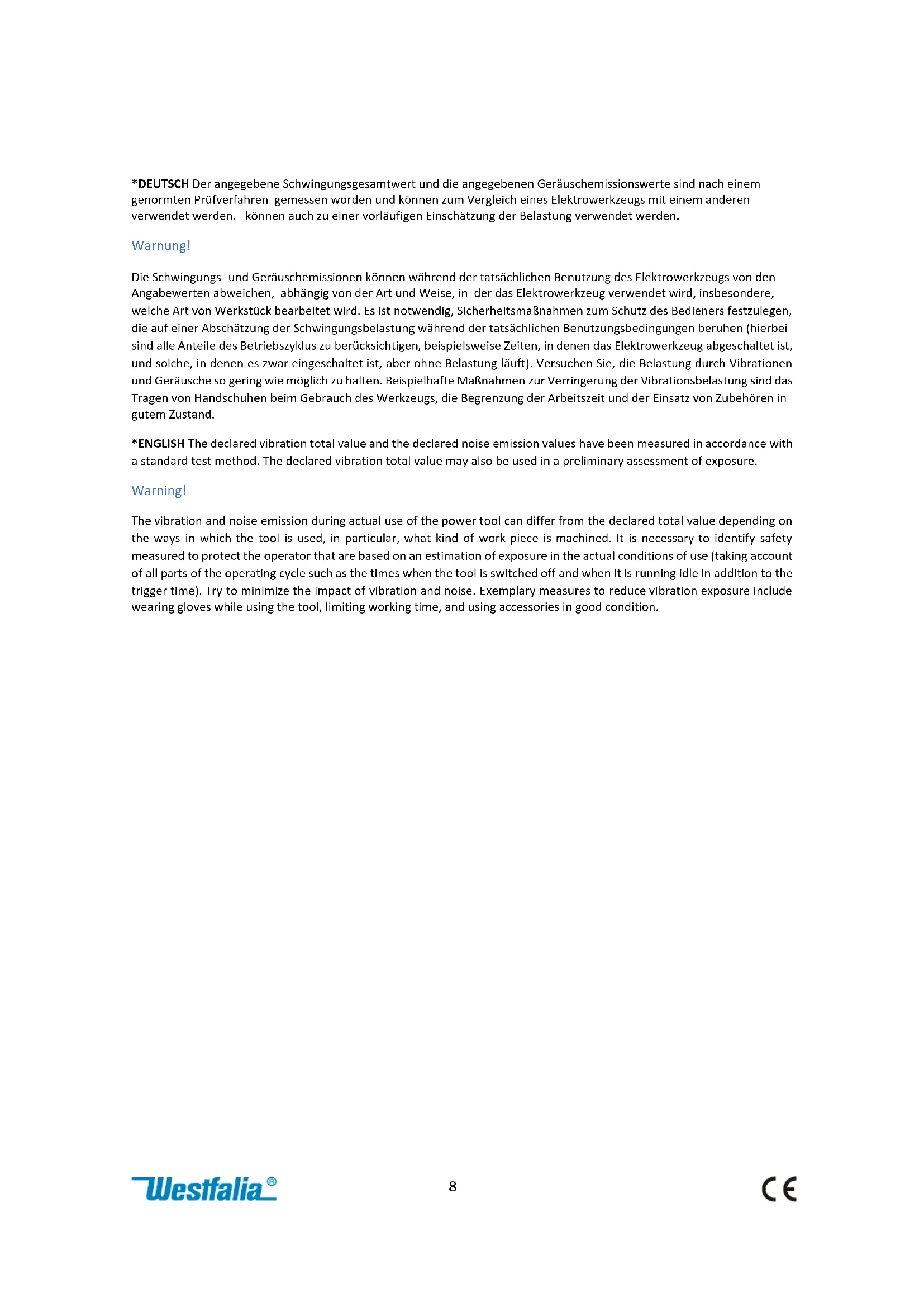 *DEUTSCH Der angegebene Schwingungsgesamtwert und die angegebenen Geräuschemissionswerte sind nach einem genormten Prüfverfahren gemessen worden und können zum Vergleich eines Elektrowerkzeugs mit einem anderen verwendet werden. können auch zu einer vorläufigen Einschätzung der Belastung verwendet werden. Warnung! Die Schwingungs- und Geräuschemissionen können während der tatsächlichen Benutzung des Elektrowerkzeugs von den Angabewerten abweichen, abhängig von der Art und Weise, in der das Elektrowerkzeug verwendet wird, insbesondere, welche Art von Werkstück bearbeitet wird. Es ist notwendig, Sicherheitsmaßnahmen zum Schutz des Bedieners festzulegen, die auf einer Abschätzung der Schwingungsbelastung während der tatsächlichen Benutzungsbedingungen beruhen (hierbei sind alle Anteile des Betriebszyklus zu berücksichtigen, beispielsweise Zeiten, in denen das Elektrowerkzeug abgeschaltet ist, und solche, in denen es zwar eingeschaltet ist, aber ohne Belastung läuft). Versuchen Sie, die Belastung durch Vibrationen und Geräusche so gering wie möglich zu halten. Beispielhafte Maßnahmen zur Verringerung der Vibrationsbelastung sind das Tragen von Handschuhen beim Gebrauch des Werkzeugs, die Begrenzung der Arbeitszeit und der Einsatz von Zubehören in gutem Zustand. *ENGLISH The declared vibration total value and the declared noise emission values have been measured in accordance with a standard test method. The declared vibration total value may also be used in a preliminary assessment of exposure. Warning! The vibration and noise emission during actual use of the power tool can differ from the declared total value depending on the ways in which the tool is used, in particular, what kind of work piece is machined. It is necessary to identify safety measured to protect the operator that are based on an estimation of exposure in the actual conditions of use (taking account of all parts of the operating cycle such as the times when the tool is switched off and when it is running idle in addition to the trigger time). Try to minimize the impact of vibration and noise. Exemplary measures to reduce vibration exposure include wearing gloves while using the tool, limiting working time, and using accessories in good condition.9 Beachten Sie bitte zur Vermeidung von Fehlfunktionen, Schäden und gesundheitlichen Beeinträchtigungen die beigefügten Allgemeinen Sicherheitshinweise sowie folgende Hinweise: