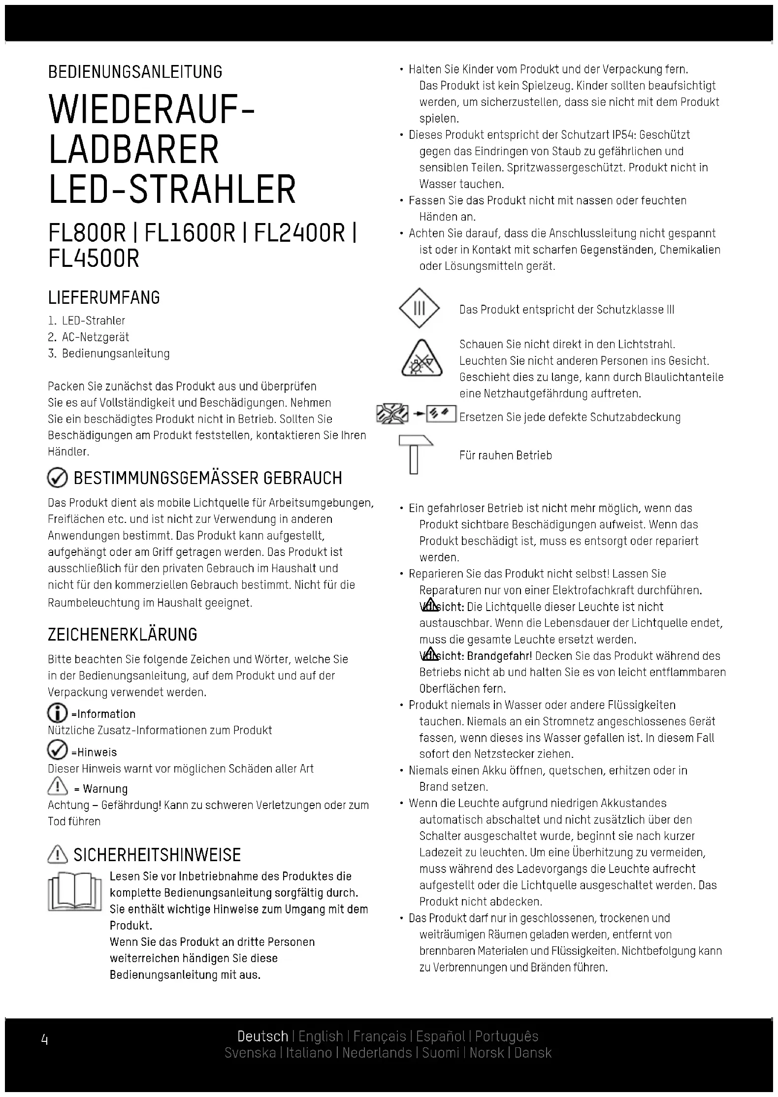 -20 bis + 45 °C Abmessungen Glas (H x B x T) – ca. 90 x 124 x 4 mm 128 x 178 x 4 mm 147 x 202 x 4 mm 114 x 90 x 4 mm Abmessungen (H x B x T) – ca. 212 x 224 x 177 mm 273 x 266 x 215 mm 292 x 273 x 213 mm 320 x 329 x 200 mm Gewicht -ca. 900 g 1440 g 2130 g 2305 g Rauer Einsatz Ja Ja Ja Nein Technische Daten Netzteile Eingangsspannung 100V – 240V AC 60 Hz/50 Hz Eingangsstrom 0,4A 0,4A 0,4A 0,75A Ausgangsspannung 12V DC 12V DC 13.5V DC 13,0V DC Ausgangsstrom 0,5A 1A 1A 1,8A Schutzklasse II Lagertemperatur -20C°… 60°C Betriebstemperatur 0 bis +40 °C Das Produkt entspricht den Anforderungen der EU-Richtlinien. www.tuv.comID 1419068824 UMWELTHINWEISE | ENTSORGUNG Entsorgen Sie die unbrauchbare Leuchte gemäß den gesetzlichen Bestimmungen. Die Kennzeichnung „Mülltonne“ weist darauf hin, dass Elektrogeräte in der EU nicht mit dem normalen Haushaltsmüll entsorgt werden dürfen. Benutzen Sie die Rückgabe- und Sammelsysteme in Ihrer Gemeinde oder wenden Sie sich an den Händler, bei dem das Produkt gekauft wurde. Geben Sie das Gerät zur Entsorgung an einer speziellen Entsorgungsstelle für Altgeräte ab. Werfen Sie das Gerät nicht in den Hausmüll, da das Gerät Batterien/Akkus enthält. Damit erfüllen Sie Ihre gesetzlichen Pflichten und leisten Ihren Beitrag zum Umweltschutz. HAFTUNGSAUSSCHLÜSSE Die in dieser Bedienungsanleitung enthaltenen Informationen können ohne Vorankündigung geändert werden. Wir übernehmen keine Haftung für direkte, indirekte, zufällige oder sonstige Schäden oder Folgeschäden, die durch unsachgemäße Handhabung oder durch Missachtung der in dieser Bedienungsanleitung enthaltenen Informationen entstehen. Bei falscher Verwendung des Produktes übernehmen wir keine Haftung und gewähren keine Gewährleistungs- oder Garantieansprüche. GARANTIEHINWEIS Auf das Produkt bieten wir eine zehnjährige Garantie, Akku ausgenommen. Bei Schäden am Produkt, die infolge Nichtbeachtung der Bedienungsanleitung entstehen, kann keine Garantie gewährt werden. Ihr gesetzlicher Gewährleistungsanspruch wird hierdurch nicht beeinträchtigt. Unsere Garantiebestimmungen finden Sie online unter www.ansmann.de7 Deutsch | English | Français | Español | Português Svenska | Italiano | Nederlands | Suomi | Norsk | Dansk OPERATING INSTRUCTIONS RECHARGEABLE LED SPOTLIGHT FL800R | FL1600R | FL2400R | FL4500R ELIVERY INCLUDES