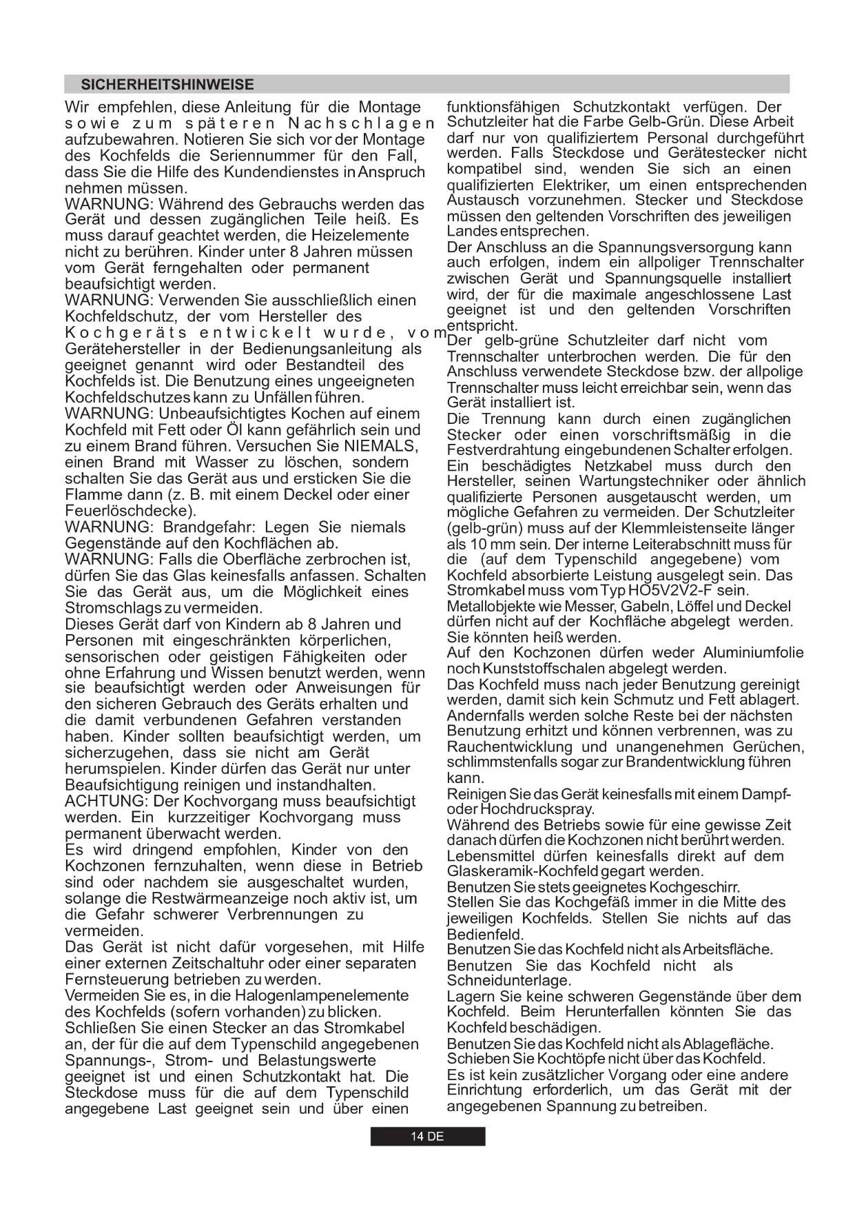 Deska hořáku Hořák Type FFD Aux 1kW Sr 1,75 kW R 2,7 kW Dc 4 kW Mono Jmenovitý tepelný vstup G20/20 mbar G30/28-30 mbar Instalační třída Napětí/frekvence V / Hz Příkon Elektrické zapalování Rozměry spotřebiče UR 3,5 kW14 DE WARNUNG: Brandgefahr: Legen Sie niemals Gegenstände auf den Kochflächen ab. Dieses Gerät darf von Kindern ab 8 Jahren und Personen mit eingeschränkten körperlichen, sensorischen oder geistigen Fähigkeiten oder ohne Erfahrung und Wissen benutzt werden, wenn sie beaufsichtigt werden oder Anweisungen für den sicheren Gebrauch des Geräts erhalten und die damit verbundenen Gefahren verstanden haben. Kinder sollten beaufsichtigt werden, um sicherzugehen, dass sie nicht am Gerät herumspielen. Kinder dürfen das Gerät nur unter Beaufsichtigung reinigen und instandhalten. Wir empfehlen, diese Anleitung für die Montage s o wi e z u m s pä t e r e n N ac h s c h l a g e n aufzubewahren. Notieren Sie sich vor der Montage des Kochfelds die Seriennummer für den Fall, dass Sie die Hilfe des Kundendienstes in Anspruch nehmen müssen. WARNUNG: Während des Gebrauchs werden das Gerät und dessen zugänglichen Teile heiß. Es muss darauf geachtet werden, die Heizelemente nicht zu berühren. Kinder unter 8 Jahren müssen vom Gerät ferngehalten oder permanent beaufsichtigt werden. WARNUNG: Verwenden Sie ausschließlich einen Kochfeldschutz, der vom Hersteller des K o c h g e r ä t s e n t w i c k e l t w u r d e , v o m Gerätehersteller in der Bedienungsanleitung als geeignet genannt wird oder Bestandteil des Kochfelds ist. Die Benutzung eines ungeeigneten Kochfeldschutzes kann zu Unfällen führen. WARNUNG: Unbeaufsichtigtes Kochen auf einem Kochfeld mit Fett oder Öl kann gefährlich sein und zu einem Brand führen. Versuchen Sie NIEMALS, einen Brand mit Wasser zu löschen, sondern schalten Sie das Gerät aus und ersticken Sie die Flamme dann (z. B. mit einem Deckel oder einer Feuerlöschdecke). WARNUNG: Falls die Oberfläche zerbrochen ist, dürfen Sie das Glas keinesfalls anfassen. Schalten Sie das Gerät aus, um die Möglichkeit eines Stromschlags zu vermeiden. Vermeiden Sie es, in die Halogenlampenelemente des Kochfelds (sofern vorhanden) zu blicken. Schließen Sie einen Stecker an das Stromkabel an, der für die auf dem Typenschild angegebenen Spannungs-, Strom- und Belastungswerte geeignet ist und einen Schutzkontakt hat. Die Steckdose muss für die auf dem Typenschild angegebene Last geeignet sein und über einen Es wird dringend empfohlen, Kinder von den Kochzonen fernzuhalten, wenn diese in Betrieb sind oder nachdem sie ausgeschaltet wurden, solange die Restwärmeanzeige noch aktiv ist, um die Gefahr schwerer Verbrennungen zu vermeiden. ACHTUNG: Der Kochvorgang muss beaufsichtigt werden. Ein kurzzeitiger Kochvorgang muss permanent überwacht werden. Das Gerät ist nicht dafür vorgesehen, mit Hilfe einer externen Zeitschaltuhr oder einer separaten Fernsteuerung betrieben zu werden. SICHERHEITSHINWEISE funktionsfähigen Schutzkontakt verfügen. Der Schutzleiter hat die Farbe Gelb-Grün. Diese Arbeit darf nur von qualifiziertem Personal durchgeführt werden. Falls Steckdose und Gerätestecker nicht kompatibel sind, wenden Sie sich an einen qualifizierten Elektriker, um einen entsprechenden Austausch vorzunehmen. Stecker und Steckdose müssen den geltenden Vorschriften des jeweiligen Landes entsprechen. Metallobjekte wie Messer, Gabeln, Löffel und Deckel dürfen nicht auf der Kochfläche abgelegt werden. Sie könnten heiß werden. Reinigen Sie das Gerät keinesfalls mit einem Dampf- oder Hochdruckspray. Der Anschluss an die Spannungsversorgung kann auch erfolgen, indem ein allpoliger Trennschalter zwischen Gerät und Spannungsquelle installiert wird, der für die maximale angeschlossene Last geeignet ist und den geltenden Vorschriften entspricht. Der gelb-grüne Schutzleiter darf nicht vom Trennschalter unterbrochen werden. Die für den Anschluss verwendete Steckdose bzw. der allpolige Trennschalter muss leicht erreichbar sein, wenn das Gerät installiert ist. Ein beschädigtes Netzkabel muss durch den Hersteller, seinen Wartungstechniker oder ähnlich qualifizierte Personen ausgetauscht werden, um mögliche Gefahren zu vermeiden. Der Schutzleiter (gelb-grün) muss auf der Klemmleistenseite länger als 10 mm sein. Der interne Leiterabschnitt muss für die (auf dem Typenschild angegebene) vom Kochfeld absorbierte Leistung ausgelegt sein. Das Stromkabel muss vom Typ HO5V2V2-F sein. Das Kochfeld muss nach jeder Benutzung gereinigt werden, damit sich kein Schmutz und Fett ablagert. Andernfalls werden solche Reste bei der nächsten Benutzung erhitzt und können verbrennen, was zu Rauchentwicklung und unangenehmen Gerüchen, schlimmstenfalls sogar zur Brandentwicklung führen kann. Die Trennung kann durch einen zugänglichen Stecker oder einen vorschriftsmäßig in die Festverdrahtung eingebundenen Schalter erfolgen. Während des Betriebs sowie für eine gewisse Zeit danach dürfen die Kochzonen nicht berührt werden. Lebensmittel dürfen keinesfalls direkt auf dem Glaskeramik-Kochfeld gegart werden. Stellen Sie das Kochgefäß immer in die Mitte des jeweiligen Kochfelds. Stellen Sie nichts auf das Bedienfeld. Benutzen Sie das Kochfeld nicht als Arbeitsfläche. Benutzen Sie das Kochfeld nicht als Schneidunterlage. Lagern Sie keine schweren Gegenstände über dem Kochfeld. Beim Herunterfallen könnten Sie das Kochfeld beschädigen. Benutzen Sie das Kochfeld nicht als Ablagefläche. Auf den Kochzonen dürfen weder Aluminiumfolie noch Kunststoffschalen abgelegt werden. Schieben Sie Kochtöpfe nicht über das Kochfeld. Es ist kein zusätzlicher Vorgang oder eine andere Einrichtung erforderlich, um das Gerät mit der angegebenen Spannung zu betreiben. Benutzen Sie stets geeignetes Kochgeschirr.15 DE Wichtig: Entnehmen Sie der Abb. 1, wie die Dichtungsstreifen angebracht werden müssen. Die Befestigung an das Möbel erfolgt mit Fixierbügel, die als Zubeh