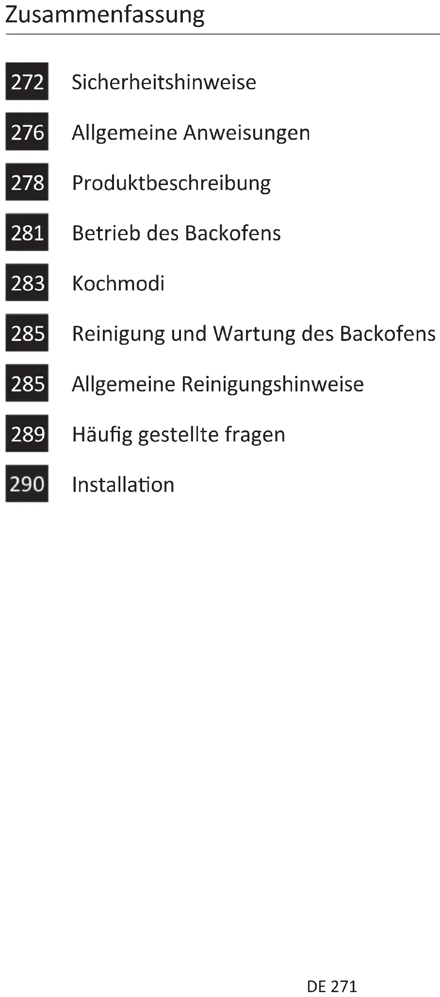 - Den Dampfgarer nicht mit scharfen, scheuernden Reinigungsmit- teln oder Metallbürsten reinigen.DE 276 DER ANSCHLUSS AN DIE STROMQUELLE DARF NUR DURCH EINEN ELEKTRIKER ODER QUALIFI- ZIERTEN TECHNIKER ERFOLGEN. Die Stromquelle, an die der Backofen angeschlossen wird, muss den gesetzlichen Voraussetzungen des Landes entsprechen. Der Hersteller übernimmt keine Haung für Schäden, die aus der Nichtbefol- gung dieser Anweisungen entstehen. Der Backofen muss entsprechend der geltenden Gesetzgebung des Landes an eine geerdete Wandsteckdose oder an einen allpoligen Trennschalter angeschlossen werden. Die Stromquelle sollte durch entsprechende Sicherungen geschützt sein und die verwen- deten Kabel müssen einen Querschni aufweisen, der eine ordnungsgemäße Stromversorgung des Backofens gewährleistet. ANSCHLUSS Der Backofen wird mit einem Stromkabel geliefert, das an eine Stromquelle mit 220- 240 Vac ang- eschlossen werden kann. Bevor der Backofen an die Stromquelle angeschlossen wird, muss Folgen- des überprü werden: Allgemeine Anweisungen Sicherheitshinweise Vielen Dank, dass Sie sich für eins unserer Produkte entschieden haben. Damit Sie lange Freude mit Ihrem Backofen haben, sollten Sie diese Bedienungsanleitung sorgfälg durchlesen und zum Nachschlagen in der Zukun auewahren. Noeren Sie sich vor dem Anschließen des Backofens die Seriennummer, sodass Sie diese im Reparaturfall an den Kundendienst weitergeben können. Den Backofen nach dem Auspacken auf mögliche Transportschäden überprüfen. Im Zweifelsfall den Ofen nicht in Betrieb nehmen und einen qualizierten Servicetechniker konsuleren. Verpackung- smaterial (Plasktüten, Styropor, Nägel usw.) außerhalb der Reichweite von Kindern auewahren. Beim ersten Einschalten des Backofens kann ein streng riechender Rauch entstehen. Dieser kann beim ersten Erhitzen durch den Kleber auf den Dämmplaen hervorgerufen werden. Dies ist bei der ersten Inbetriebnahme ein normaler Vorgang; es sollte jedoch abgewartet werden, bis der Rauch sich verzogen hat, bis Lebensmiel in den Ofen geschoben werden. Der Hersteller übernimmt keine Verantwortung in Fällen, wo die in diesem Dokument enthaltenen Anweisungen nicht beachtet werden. HINWEIS: Die in diesem Handbuch erwähnten Funkonen, Eigenschaen und Zubehörteile können je nach gekauem Modell variieren. Den Backofen nur zum vorbesmmten Zweck, das heißt, für das Garen von Lebensmieln einsetzen. Alle anderen Verwendungsmöglichkeiten wie beispielsweise als Heizungsquelle gelten als unsach- gemäß und sind daher gefährlich. Der Hersteller übernimmt keine Haung für Schäden, die aus einer falschen, unsachgemäßen oder unverständlichen Verwendung hervorgehen. Der Betrieb elektrischer Geräte erfordert die Einhaltung einiger Grundregeln: - Das Gerät nicht am Stromkabel aus der Steckdose ziehen. - Gerät nicht mit nassen oder feuchten Händen oder Füßen berühren. - Die Verwendung von Adaptern, Mehrfachsteckern und Verlängerungskabeln wird nicht empfohlen. - Bei einer Fehlfunkon beziehungsweise bei unzulänglichem Betrieb Gerät ausschalten und nicht önen. Elektrische SicherheitDE 277 - Spannung des Stromnetzes mit dem Messgerät; - Beschaenheit und Umfeld des Trennschalters. Die mit der Erdungsklemme des Backofens verbundene Schutzleitung muss mit der Erdungsklemme der Stromquelle verbunden werden. WARNUNG Vor dem Anschließen des Backofens an die Stromquelle einen qualizierten Elektriker darum bien, die Konnuität der Erdungsklemme an der Stromquelle zu überprüfen. Der Hersteller übernimmt keine Verantwortung für Unfälle oder sonsge Probleme, die aus einem nicht sachgemäßen An- schluss des Backofens an die Erdungsklemme oder an einen geerdeten Anschluss mit defekter Kon- nuität entstehen können. HINWEIS: Für eine eventuelle Wartung des Ofens ist die Zugänglichkeit einer zweiten Wandsteck- dose von Vorteil, sodass er an diese angeschlossen werden kann, wenn er ausgebaut werden muss. Das Stromkabel darf nur von qualizierten Kundendiensechnikern oder Elektrikern ausgetauscht werden. Erste Verwendung VORBEREITENDE REINIGUNG: Reinigen Sie den Backofen vor der ersten Inbetriebnahme. Wischen Sie die Au- ßenächen mit einem feuchten, weichen Tuch ab. Waschen Sie alle Zubehörteile und wischen Sie das Innere des Backofens mit einer Lösung aus heißem Wasser und Spülmiel ab. Stellen Sie den leeren Backofen auf die Höchsemperatur und lassen Sie ihn etwa 1 Stunde lang eingeschaltet. Dadurch werden alle verbleibenden Neugeruchsspuren enernt. Empfehlungen Einbau und Installaon Es empehlt sich, den Backofen nach jeder Verwendung grob zu reinigen. Die Ofenwände nicht mit Aluminiumfolie oder sonsger im Handel erhältlicher Einmalschutzfolie aus- kleiden. Gerät die Aluminiumfolie oder sonsge Schutzfolie mit der heißen Emaille in Berührung, so kann sie schmelzen und die Qualität der Backofenbeschichtung beeinträchgen. Es wird empfohlen, den Backofen nicht bei sehr hohen Temperaturen zu betreiben, um eine übermäßige Verschmutzung und unangenehme Rauch- und Geruchsentwicklung zu vermeiden. Es ist besser, bei niedrigerer Tempera- tur die Garzeit zu erhöhen. Zusätzlich zum mitgelieferten Zubehör sollten nur temperatur- und hitze- beständige Backformen und ofenfestes Geschirr verwendet werden. Der Hersteller ist nicht zur Installaon verpichtet. Wird das Eingreifen des Hersteller erforderlich, um Fehler zu beheben, die aus einer falschen Installaon hervorgehen, so erfolgt dieses nicht im Rahmen der Gewährleistungsgarane. Die Installaonsanweisungen für qualiziertes Fachpersonal müssen befolgt werden. Eine falsche Installaon kann Personen- oder Sachschäden hervorrufen. Für derarge Schäden oder Verletzungen übernimmt der Hersteller keine Haung. Der Backofen kann oben in einem Einbauschrank oder unter der Arbeitsäche eingebaut werden. Vor dem Fixieren muss gewährleistet sein, dass im Backofenraum genügend Fischlu zirkulieren kann, um die Kühlung und den Schutz der innenliegende