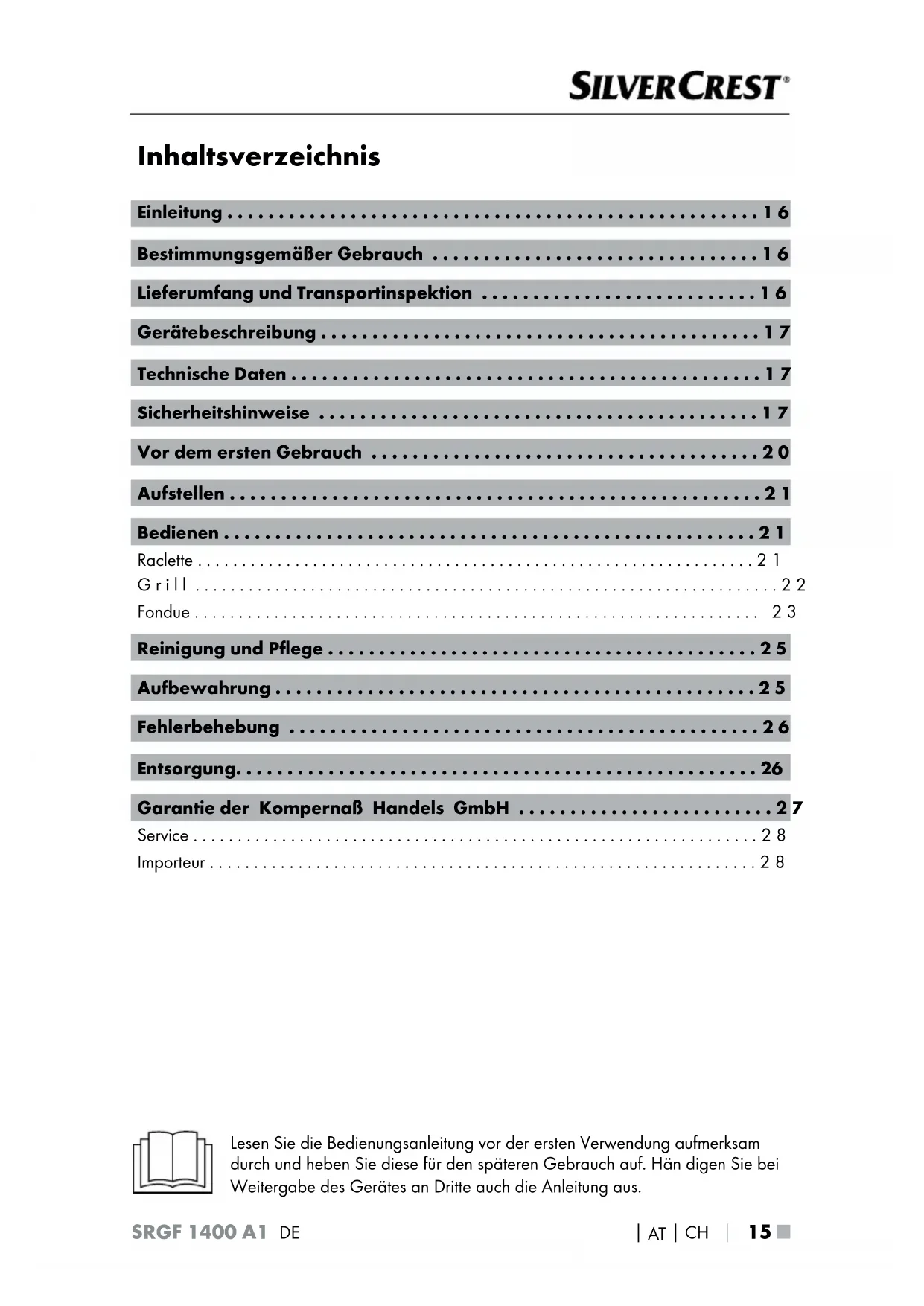 - Importeur Lesen Sie die Bedienungsanleitung vor der ersten Verwendung aufmerksam durch und heben Sie diese für den späteren Gebrauch auf. Hän digen Sie bei Weitergabe des Gerätes an Dritte auch die Anleitung aus.SRGF 1400 A1 ■ 16 p. 28