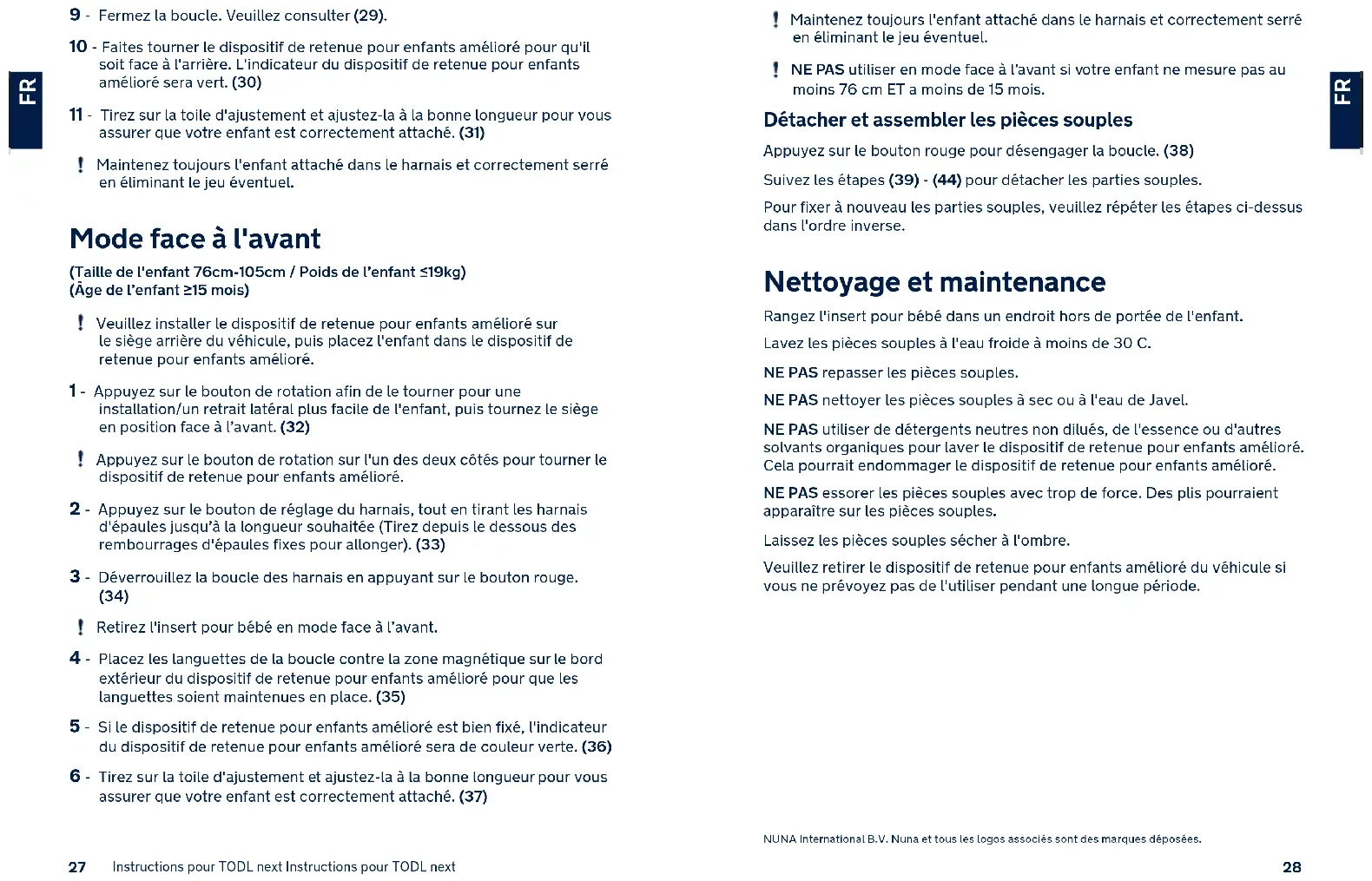 Länge ein, so dass Ihr Kind sicher ordnungsgemäß wird. (37) Achten Sie stets darauf, dass Ihr Kind sicher angeschnallt und gut befestigt ist, indem Sie jeglichen Durchhang beseitigen. Verwenden Sie das Produkt NICHT in Fahrtrichtung, bevor das Kind mindestens 76 cm groß UND 15 Monate alt ist. Textilteile anbringen und entfernen Drücken Sie den roten Knopf zum Lösen der Schnalle. (38) Befolgen Sie zum Abnehmen der Textilteile die Schritte (39) - (44). Bringen Sie die Textilteile wieder an, indem Sie die obigen Schritte in umgekehrter Reihenfolge befolgen. Reinigung und Wartung Bitte bewahren Sie den Babyeinsatz außerhalb der Reichweite von Kindern auf. Bitte waschen Sie die Textilteile mit kaltem Wasser unter 30 °C. Sie dürfen die Textilteile NICHT bügeln. Sie dürfen die Textilteile NICHT bleichen oder in die chemische Reinigung geben. Reinigen Sie dieses fortschrittliche Kinderrückhaltesystem NICHT mit unverdünntem, neutralen Reinigungsmittel, Benzin oder einem anderen organischen Lösungsmittel. Diese können das fortschrittliche Kinderrückhaltesystem beschädigen. Wringen Sie die Textilteile NICHT kräftig aus. Andernfalls könnten an den Textilteilen Falten zurückbleiben. Bitte hängen Sie die Textilteile zum Trocknen im Schatten auf. Bitte entfernen Sie das fortschrittliche Kinderrückhaltesystem vom Fahrzeugsitz, wenn es längere Zeit nicht verwendet wird. NUNA International B.V. Nuna und alle zugehörigen Logos sind Marken.4443 Instructies TODL next Instructies TODL next