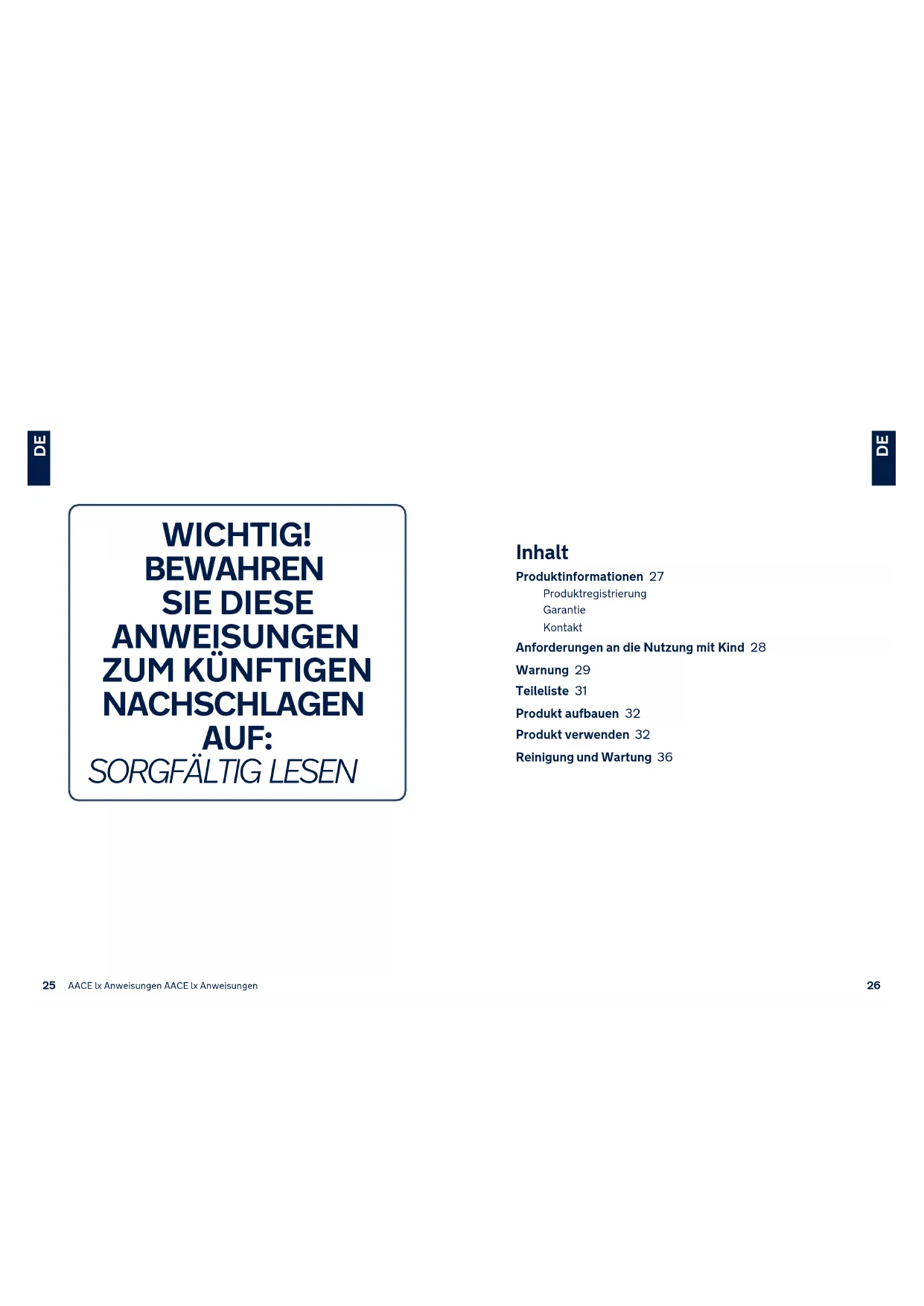Instructions AACE lx Instructions AACE lxInhalt Produktinformationen 27 Produktregistrierung Garantie Kontakt Anforderungen an die Nutzung mit Kind 28 Warnung 29 Teileliste 31 Produkt aufbauen 32 Produkt verwenden 32 Reinigung und Wartung 36 WICHTIG! BEWAHREN SIE DIESE ANWEISUNGEN