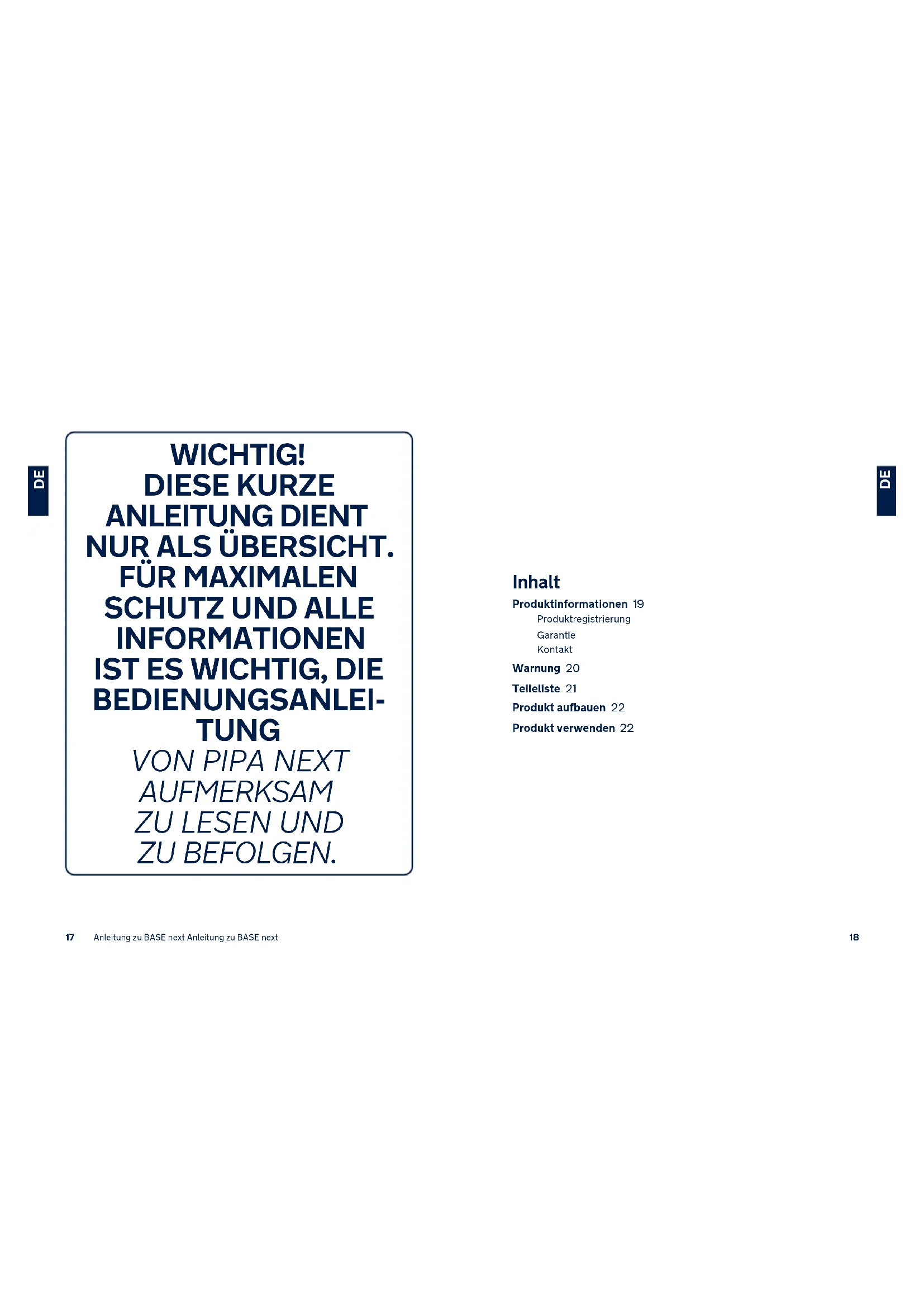 Inhalt Produktinformationen 19 ProduktregistrierungGarantieKontakt Warnung 20 Teileliste 21 Produkt aufbauen 22 Produkt verwenden 22 WICHTIG! DIESE KURZE ANLEITUNG DIENT NUR ALS ÜBERSICHT.