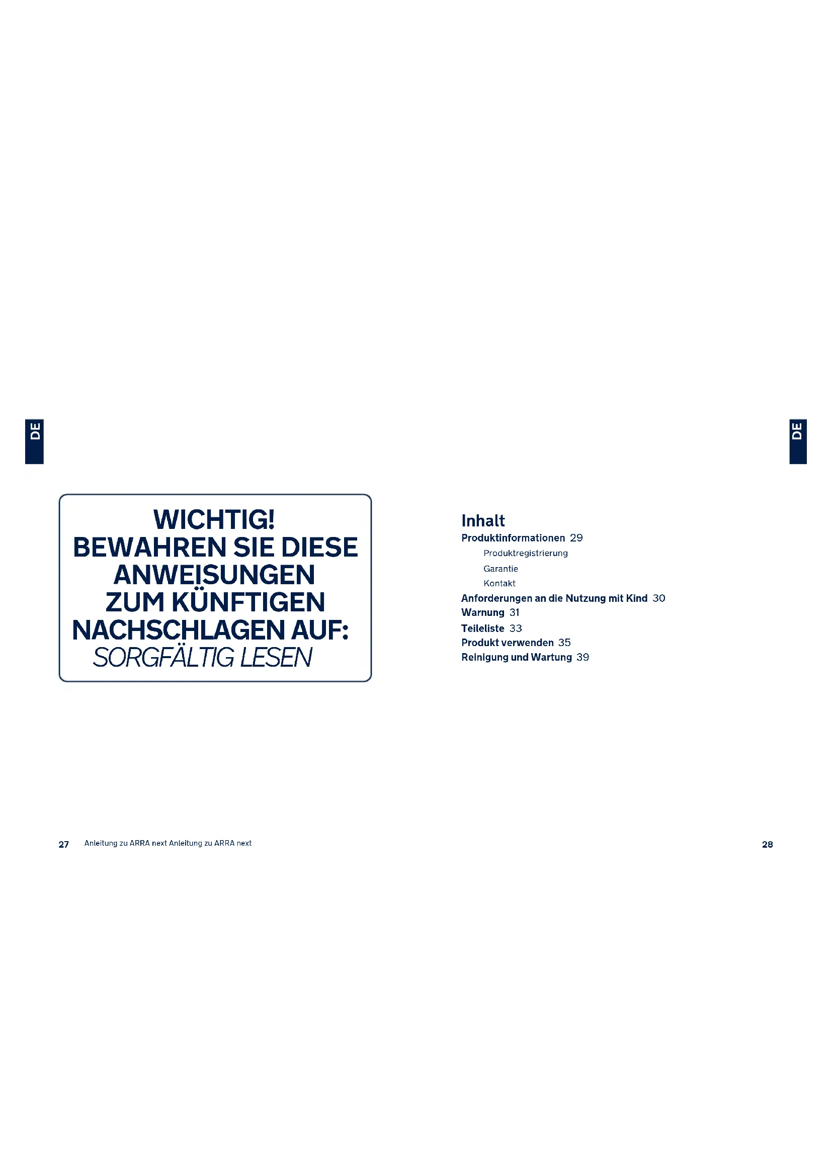Inhalt Produktinformationen 29 Produktregistrierung Garantie Kontakt Anforderungen an die Nutzung mit Kind 30 Warnung 31 Teileliste 33 Produkt verwenden 35 Reinigung und Wartung 39 WICHTIG!