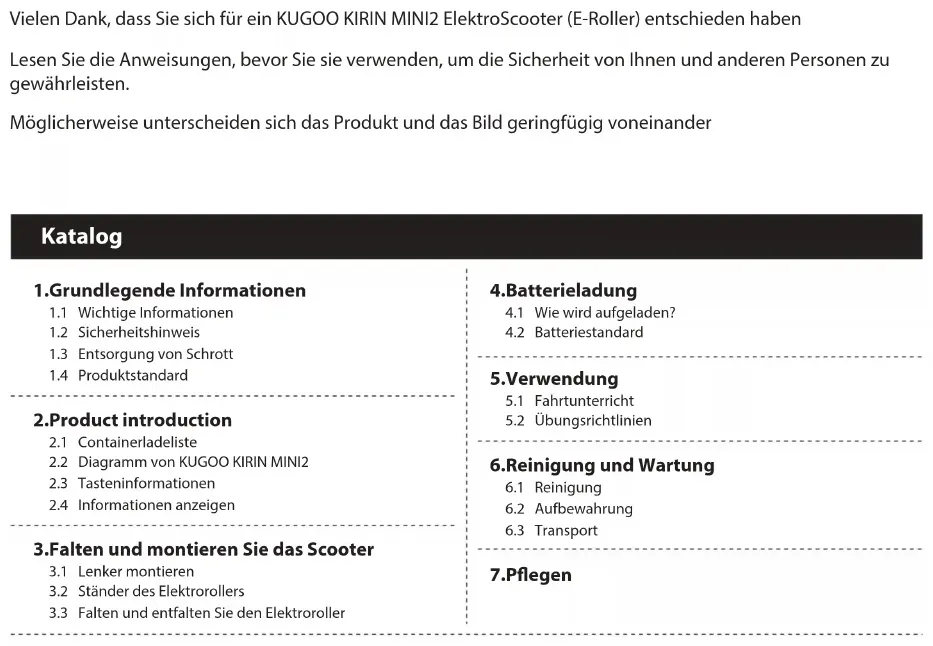 KatalogKaufdaten: Scootercode code: Kapitel 1 Grundlegende Informationen Diese Anleitung erklärt Ihnen die Funktion function Nutzung und Wartung des KUGOO KIRIN MINI2. Bitte bereiten Sie Ihre Kaunformationen vor, bevor Sie sich an den Kundendienst wenden, da die Informationen für diesen Vorgang benötigt werden. Bitte beachten Sie die Regeln in dieser Anleitung