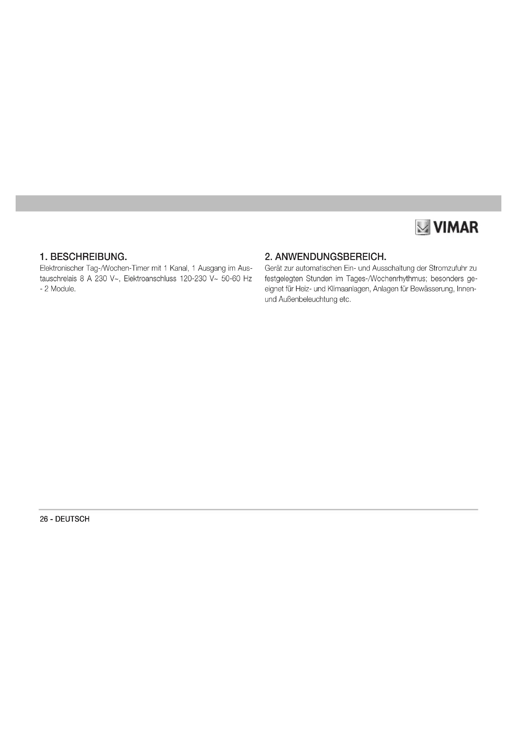 Gerät zur automatischen Ein- und Ausschaltung der Stromzufuhr zu festgelegten Stunden im Tages-/Wochenrhythmus; besonders ge- eignet für Heiz- und Klimaanlagen, Anlagen für Bewässerung, Innen- und Außenbeleuchtung etc.DEUTSCH - 27