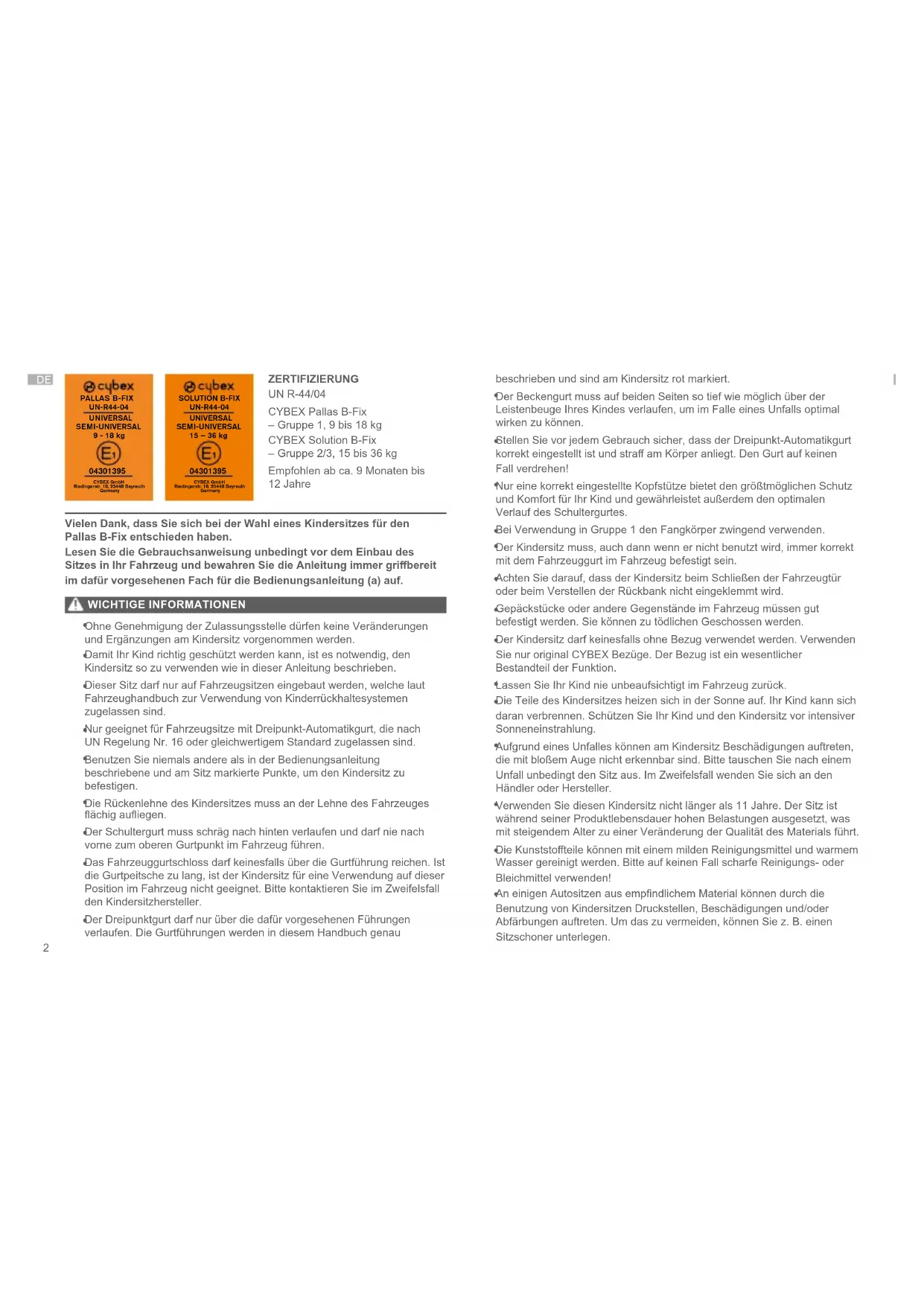 ZERTIFIZIERUNG UN R-44/04 CYBEX Pallas B-Fix – Gruppe 1, 9 bis 18 kg CYBEX Solution B-Fix – Gruppe 2/3, 15 bis 36 kg Empfohlen ab ca. 9 Monaten bis 12 Jahre beschrieben und sind am Kindersitz rot markiert.