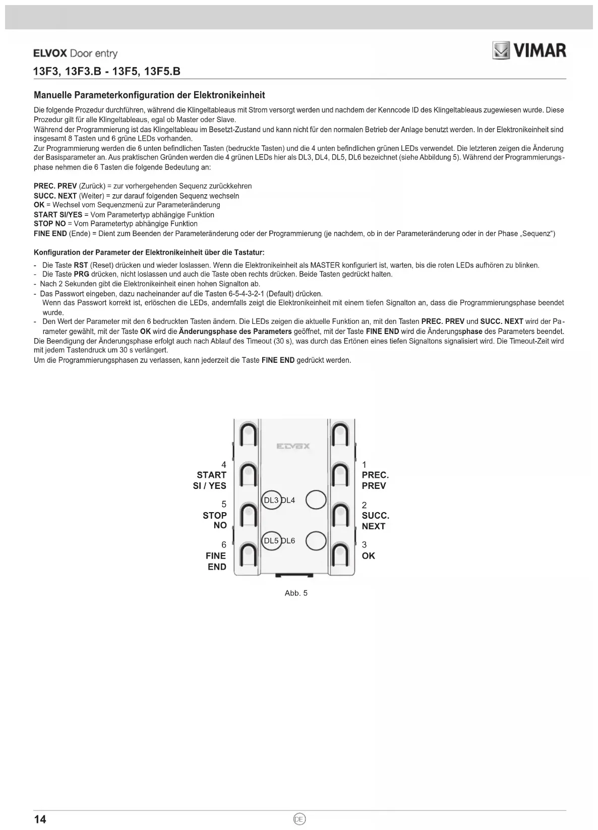 13F3, 13F3.B - 13F5, 13F5.BManuelle Parameterkonfiguration der Elektronikeinheit Die folgende Prozedur durchführen, während die Klingeltableaus mit Strom versorgt werden und nachdem der Kenncode ID des Klingeltableaus zugewiesen wurde. Diese Prozedur gilt für alle Klingeltableaus, egal ob Master oder Slave. Während der Programmierung ist das Klingeltableau im Besetzt-Zustand und kann nicht für den normalen Betrieb der Anlage benutzt werden. In der Elektronikeinheit sind insgesamt 8 Tasten und 6 grüne LEDs vorhanden. Zur Programmierung werden die 6 unten befindlichen Tasten (bedruckte Tasten) und die 4 unten befindlichen grünen LEDs verwendet. Die letzteren zeigen die Änderung der Basisparameter an. Aus praktischen Gründen werden die 4 grünen LEDs hier als DL3, DL4, DL5, DL6 bezeichnet (siehe Abbildung 5). Während der Programmierungs