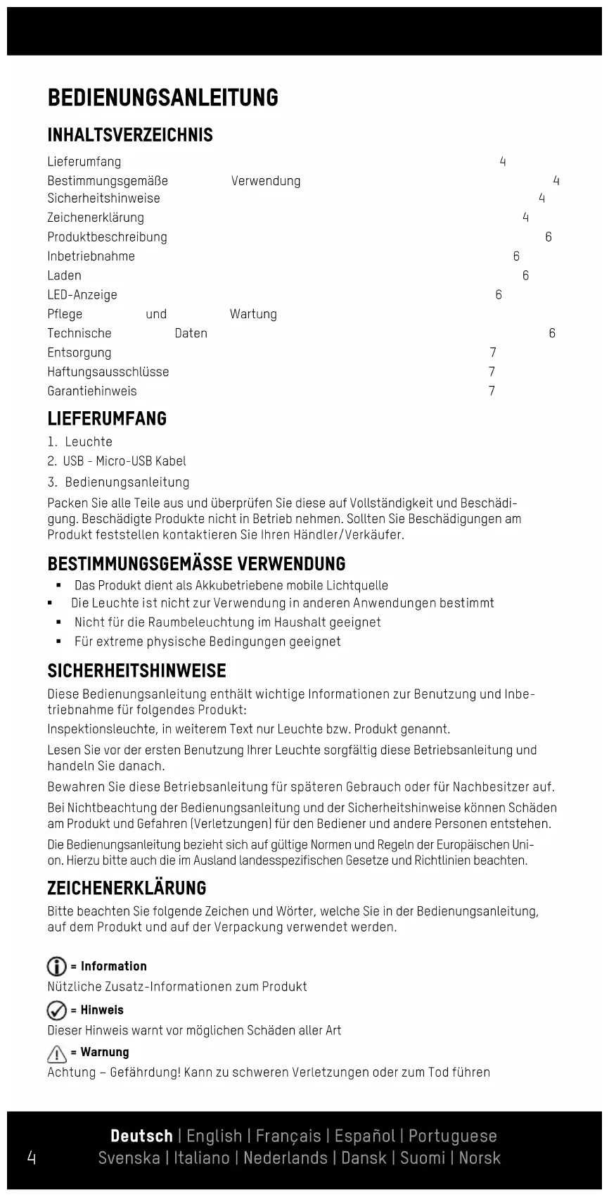 § Das Produkt dient als Akkubetriebene mobile Lichtquelle § Die Leuchte ist nicht zur Verwendung in anderen Anwendungen bestimmt § Nicht für die Raumbeleuchtung im Haushalt geeignet § Für extreme physische Bedingungen geeignet SICHERHEITSHINWEISE Diese Bedienungsanleitung enthält wichtige Informationen zur Benutzung und Inbe- triebnahme für folgendes Produkt: Inspektionsleuchte, in weiterem Text nur Leuchte bzw. Produkt genannt. Lesen Sie vor der ersten Benutzung Ihrer Leuchte sorgfältig diese Betriebsanleitung und handeln Sie danach. Bewahren Sie diese Betriebsanleitung für späteren Gebrauch oder für Nachbesitzer auf. Bei Nichtbeachtung der Bedienungsanleitung und der Sicherheitshinweise können Schäden am Produkt und Gefahren (Verletzungen) für den Bediener und andere Personen entstehen. Die Bedienungsanleitung bezieht sich auf gültige Normen und Regeln der Europäischen Uni- on. Hierzu bitte auch die im Ausland landesspezifischen Gesetze und Richtlinien beachten. ZEICHENERKLÄRUNG Bitte beachten Sie folgende Zeichen und Wörter, welche Sie in der Bedienungsanleitung, auf dem Produkt und auf der Verpackung verwendet werden. = Information Nützliche Zusatz-Informationen zum Produkt = Hinweis Dieser Hinweis warnt vor möglichen Schäden aller Art = Warnung Achtung – Gefährdung! Kann zu schweren Verletzungen oder zum Tod führen Lieferumfang 4 Bestimmungsgemäße Verwendung 4 Sicherheitshinweise 4 Zeichenerklärung 4 Produktbeschreibung 6 Inbetriebnahme 6 Laden 6 LED-Anzeige 6 Pflege und Wartung 6 Technische Daten 6 Entsorgung 7 Haftungsausschlüsse 7 Garantiehinweis 7 Deutsch | English | Français | Español | Portuguese Svenska | Italiano | Nederlands | Dansk | Suomi | Norsk5 SICHERHEITSHINWEISE BEACHTEN! Augenverletzungen vermeiden - Nie direkt in den Lichtstrahl schauen oder anderen Per- sonen ins Gesicht leuchten. Geschieht dies zu lange, kann durch Blaulichtanteile eine Netzhautgefährdung auftreten. Falls ein Lichtstrahl in die Augen trifft, sind die Augen zu schließen und der Kopf sollte von dem Lichtstrahl abgewendet werden. Diese Lampe überschreitet die Bedingungen der risikofreien Nutzung. Das Risiko bei der Verwendung hängt davon ab, wie der Nutzer mit der Lampe umgeht. (1) Dieser Wert gibt den Faktor an, um wieviel der Risikogruppengrenzwert zu der nächst niedrigeren Gruppe überschritten wird. Der Grenzwert liegt bei 1. (2) Abstand von Auge zur Lampe, bei welchem die entsprechende Risikogruppe zutref- fend ist. Risk group 2 Gefahrenwert der Exposition / Exposure Hazard Value (EHV) (1) : 12 Risikogruppe Gefährdungsabstand / Hazard Distance (HD) (2) 2 0m bis 0,7m 1 0,7m bis 7m Free group > 7m § Angaben für Leuchte, Netzteil sowie Netzspannung an der Steckdose müssen mit dem Typenschild übereinstimmen. § Bei Beschädigungen am Gehäuse, Stecker, Kabel oder Netzteil das Produkt nicht in Betrieb nehmen. Wenden Sie sich an den autorisierten Fachhandel oder an die Serviceadresse des Herstellers. § Produkt nicht öffnen oder modifizieren! Instandsetzungsarbeiten sowie Akkupack- wechsel dürfen nur vom Hersteller oder einem von ihm beauftragten Servicetechni- ker oder einer vergleichbar qualifizierten Person durchgeführt werden. § Halten Sie Kinder vom Produkt und der Verpackung fern. Das Produkt ist kein Spiel- zeug. Kinder sollten beaufsichtigt werden, um sicherzustellen, dass sie nicht mit dem Produkt spielen. § Dieses Produkt ist nicht zur Verwendung durch Personen (Kinder mit eingeschlos- sen) bestimmt, welche eingeschränkte körperliche, sensorische oder geistige Fähigkeiten aufweisen bzw. fehlende Erfahrung und Kenntnis im Umgang mit diesem Produkt haben. Solche Personen müssen von einer für ihre Sicherheit verantwort- lichen Aufsichtsperson zuerst instruiert oder während der Produktbedienung beauf- sichtigt werden! § Die LED Lichtquelle ist nicht austauschbar, wenn die Lebensdauer der LED endet muss die komplette Leuchte ersetzt werden § Alle angeleuchteten Gegenstände müssen mindestens 10cm von der Lampe ent- fernt sein! § Das Leuchte nur nach bestimmungsgemäßer Verwendung benutzt werden. § Produkt ist nicht zum Spielen geeignet. § Produkt außer Reichweite von Kindern aufbewahren! § Nichtbeachtung der Sicherheitshinweise kann zu Schäden am Gerät oder zu gefähr- lichen Verletzungen von Personen führen! § Halten Sie das Produkt stets trocken ACHTUNG: § Das Produkt enthält einen nicht austauschbaren Li-Ionen-Akku. Werden Sie das Produkt nichts ins Feuer! § Das Produkt darf nur in geschlossenen, trockenen und weiträumigen Räumen gela- den werden, entfernt von brennbaren Materialen und Flüssigkeiten. Nichtbefolgung kann zu Verbrennungen und Bränden führen. § Niemals einen Akku öffnen, quetschen, erhitzen oder in Brand setzen. Deutsch | English | Français | Español | Portuguese Svenska | Italiano | Nederlands | Dansk | Suomi | Norsk6 § Produkt nicht in explosionsgefährdeter Umgebung und im Regen verwenden sowie nicht übermäßiger Wärme aussetzen. § Produkt nicht verwenden, wenn das Produkt beschädigt zu sein scheint PRODUKTBESCHREIBUNG (SIEHE SEITE 2)