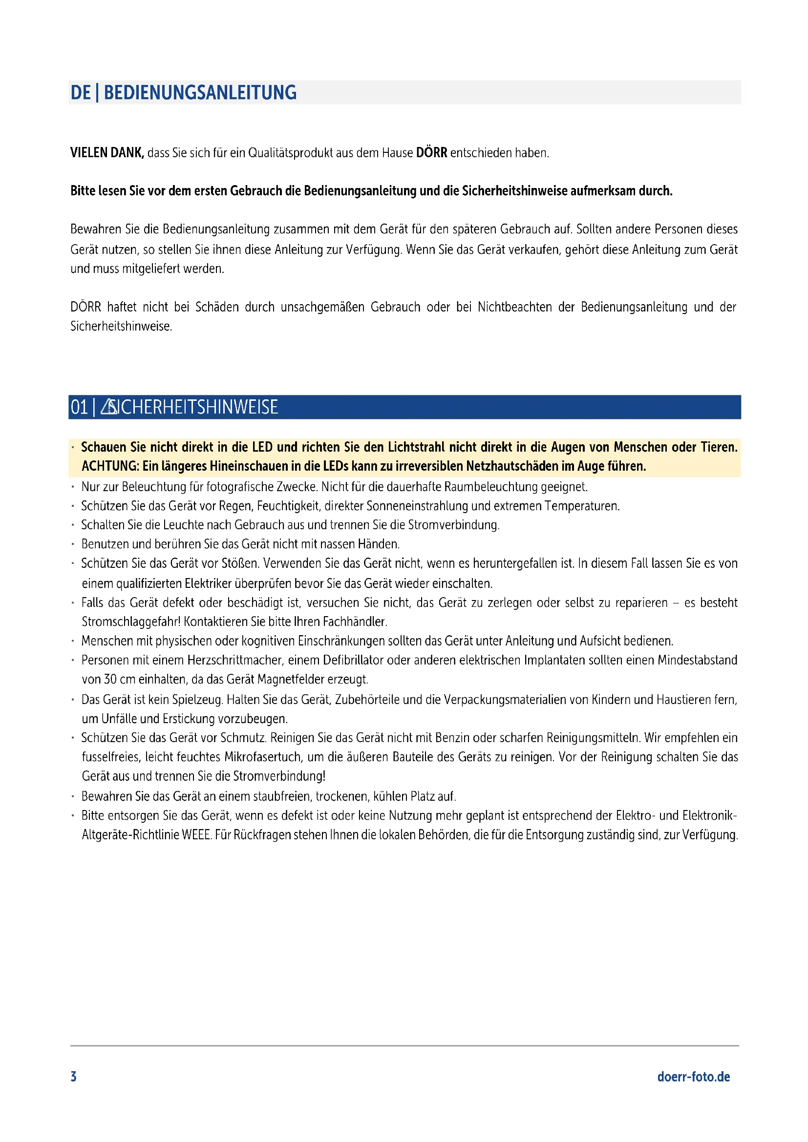 VIELEN DANK, dass Sie sich für ein Qualitätsprodukt aus dem Hause DÖRR entschieden haben. Bitte lesen Sie vor dem ersten Gebrauch die Bedienungsanleitung und die Sicherheitshinweise aufmerksam durch. Bewahren Sie die Bedienungsanleitung zusammen mit dem Gerät für den späteren Gebrauch auf. Sollten andere Personen dieses Gerät nutzen, so stellen Sie ihnen diese Anleitung zur Verfügung. Wenn Sie das Gerät verkaufen, gehört diese Anleitung zum Gerät und muss mitgeliefert werden. DÖRR haftet nicht bei Schäden durch unsachgemäßen Gebrauch oder bei Nichtbeachten der Bedienungsanleitung und der Sicherheitshinweise.
