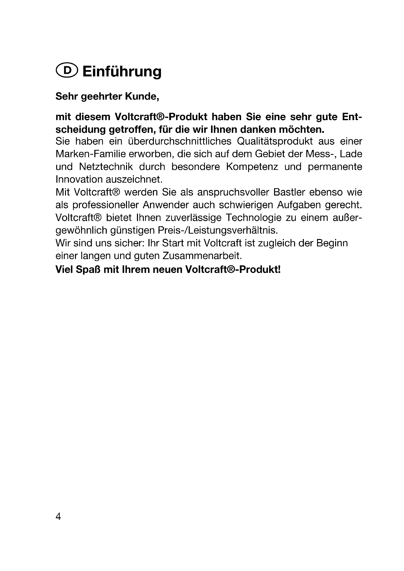 - Deze gebruiksaanwijzing hoort bij dit product en bevat belan- grijke richtlijnen voor de ingebruikneming en het gebruik. Let hierop, ook als u dit product aan derden doorgeeft. Bewaar daarom de gebruiksaanwijzing om deze in voorkomende geval- len te kunnen raadplegen! In de inhoudsopgave op pagina 38 vindt u puntsgewijs de behandelde onderwerpen met vermelding van het bijbehorende paginanummer.3 Einführung Sehr geehrter Kunde, mit diesem Voltcraft®-Produkt haben Sie eine sehr gute Ent- scheidung getroffen, für die wir Ihnen danken möchten. Sie haben ein überdurchschnittliches Qualitätsprodukt aus einer Marken-Familie erworben, die sich auf dem Gebiet der Mess-, Lade und Netztechnik durch besondere Kompetenz und permanente Innovation auszeichnet. Mit Voltcraft® werden Sie als anspruchsvoller Bastler ebenso wie als professioneller Anwender auch schwierigen Aufgaben gerecht. Voltcraft® bietet Ihnen zuverlässige Technologie zu einem außer- gewöhnlich günstigen Preis-/Leistungsverhältnis. Wir sind uns sicher: Ihr Start mit Voltcraft ist zugleich der Beginn einer langen und guten Zusammenarbeit. Viel Spaß mit Ihrem neuen Voltcraft®-Produkt! 4Inhaltsverzeichnis Einführung p. 4