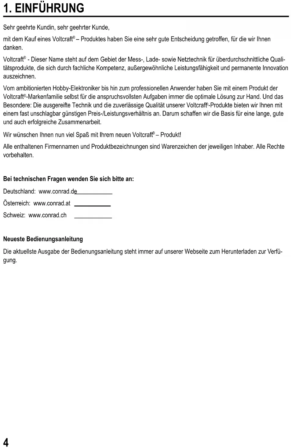– Produkt! Alle enthaltenen Firmennamen und Produktbezeichnungen sind Warenzeichen der jeweiligen Inhaber. Alle Rechte vorbehalten. Bei technischen Fragen wenden Sie sich bitte an: Deutschland: www.conrad.de Österreich: www.conrad.at Schweiz: www.conrad.ch Neueste Bedienungsanleitung Die aktuellste Ausgabe der Bedienungsanleitung steht immer auf unserer Webseite zum Herunterladen zur Verfü- gung.5