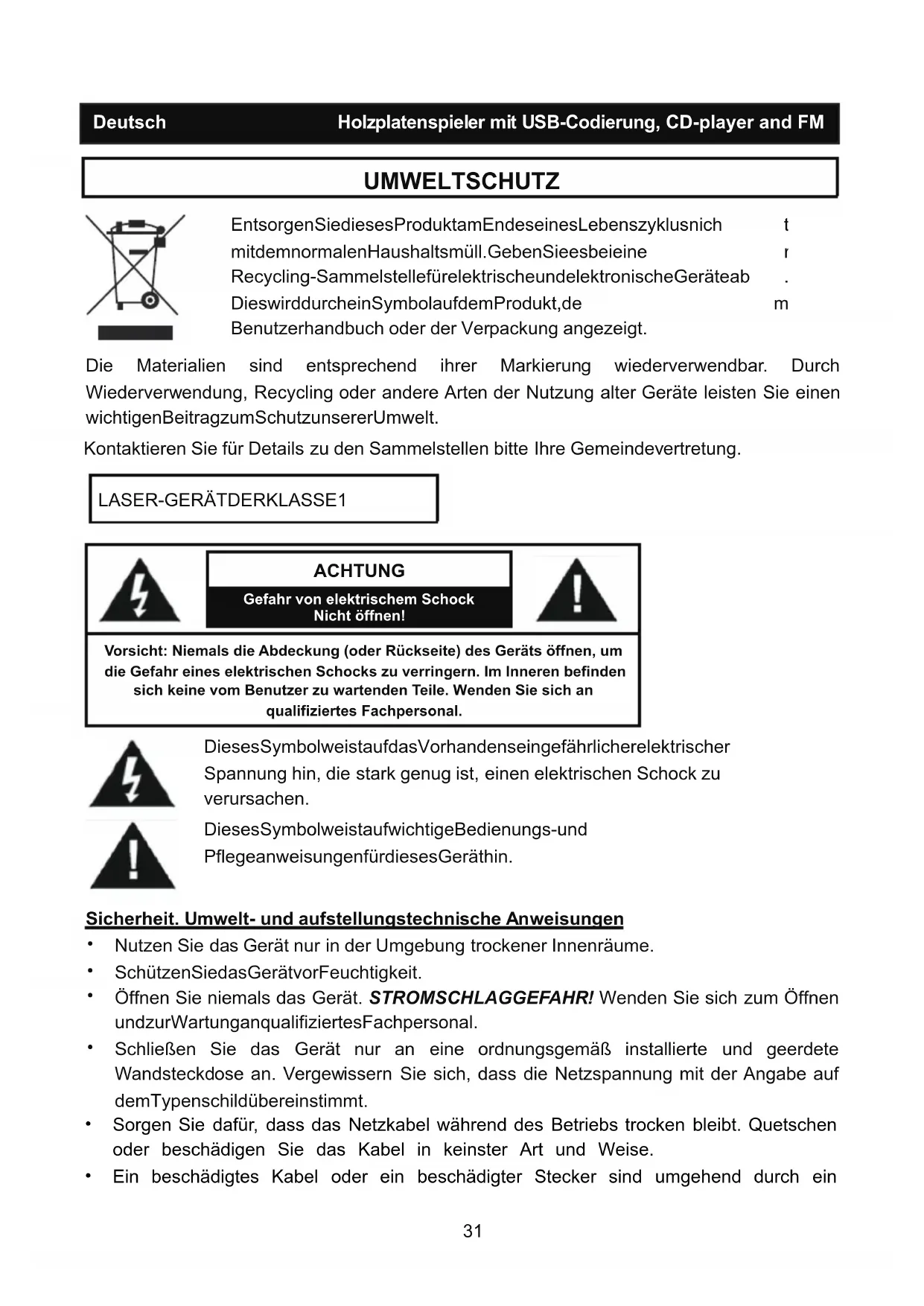 - Das Gerät ist mit einem „Klasse 1 Laser" ausgestattet. Vermeiden Sie es, in den Laserstahl zu sehen, weil dies zu Augenverletzungen führen kann.
