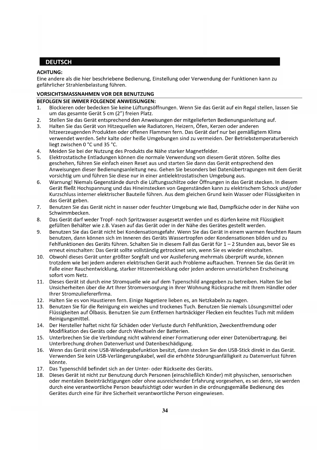 18. Dieses Gerät ist nicht zur Benutzung durch Personen (einschließlich Kinder) mit physischen, sensorischen