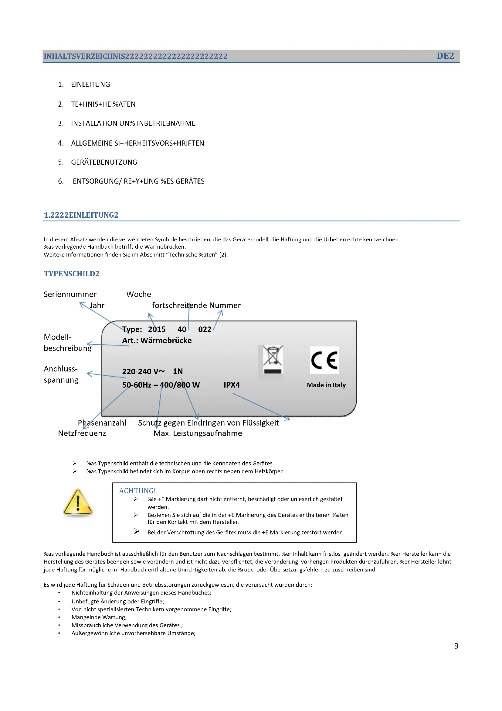 ACHTUNG! Die CE Markierung darf nicht entfernt, beschädigt oder unleserlich gestaltet werden. Beziehen Sie sich auf die in der CE Markierung des Gerätes enthaltenen Daten für den Kontakt mit dem Hersteller. Bei der Verschrottung des Gerätes muss die CE Markierung zerstört werden.10