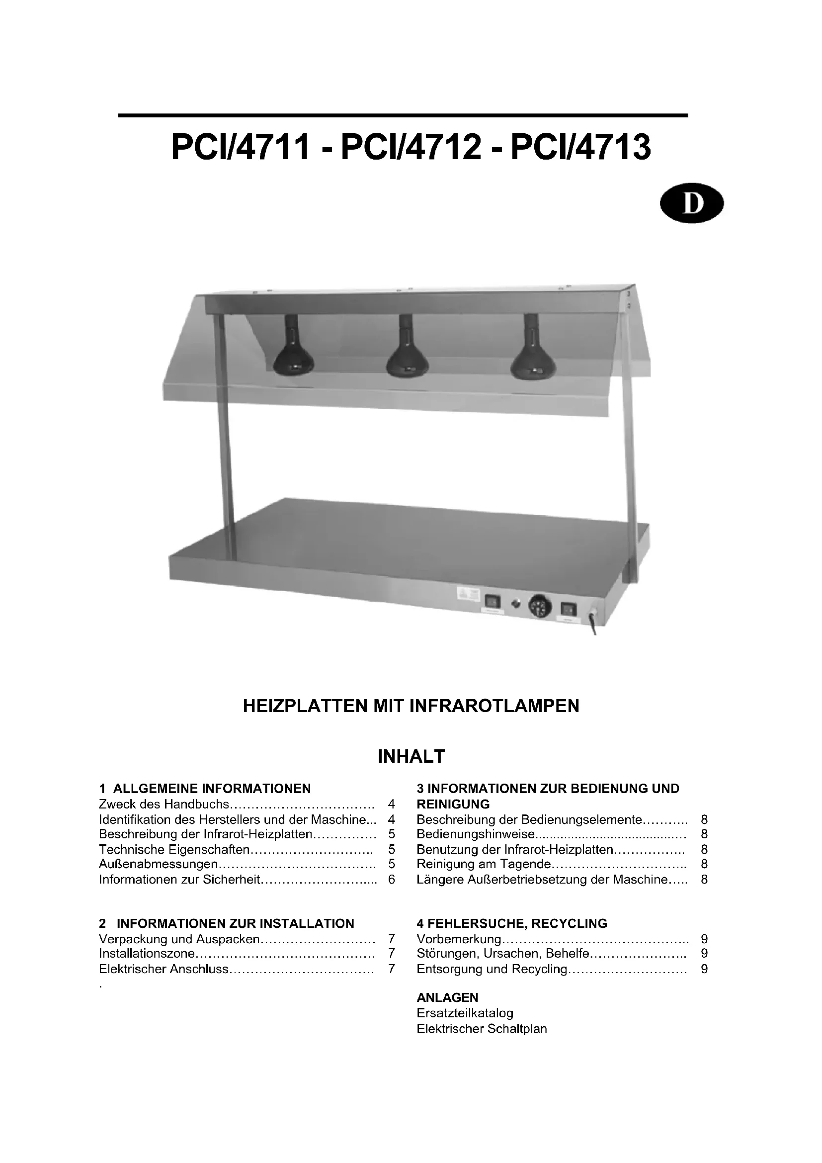 Vorbemerkung Bei Defekten oder Betriebsstörungen ziehen Sie den Netzstecker und nehmen Kontakt mit dem Technischen Kundendienst Ihres Händlers auf. Montieren Sie nicht die internen Teile der Maschine ab. Der Hersteller übernimmt keinerlei Haftung für eventuelle Manipulationen! Störungen, Ursachen, Behelfe Störung Ursache BehelfHauptschalter abgestelltHauptschalter einschaltenDie Maschine heizt nichtSpannung auf der Versorgungsleitung fehltNehmen Sie Kontakt mit demTechnischen Kundendienst IhresHändlers aufWiderstand nicht funktionstüchtigNehmen Sie Kontakt mit demTechnischen Kundendienst IhresHändlers auf Entsorgung und Recycling Die Maschine wurde für eine durchschnittliche Lebensdauer von 10.000 Betriebsstunden entwickelt und konstruiert.. Am Ende der Maschinennutzung sind die nationalen gesetzlichen Vorschriften betreffend Entsorgung und Recycling zu befolgen. Bitte nehmen Sie diesbezüglich Kontakt mit den zuständigen Umweltbehörden oder Entsorgungsstellen auf.PCI/4711 - PCI/4712 - PCI/4713